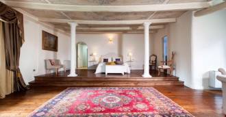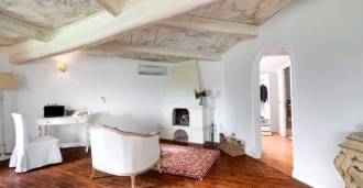 • en rummelig reception med håndmalede lofter og en stenkamin;