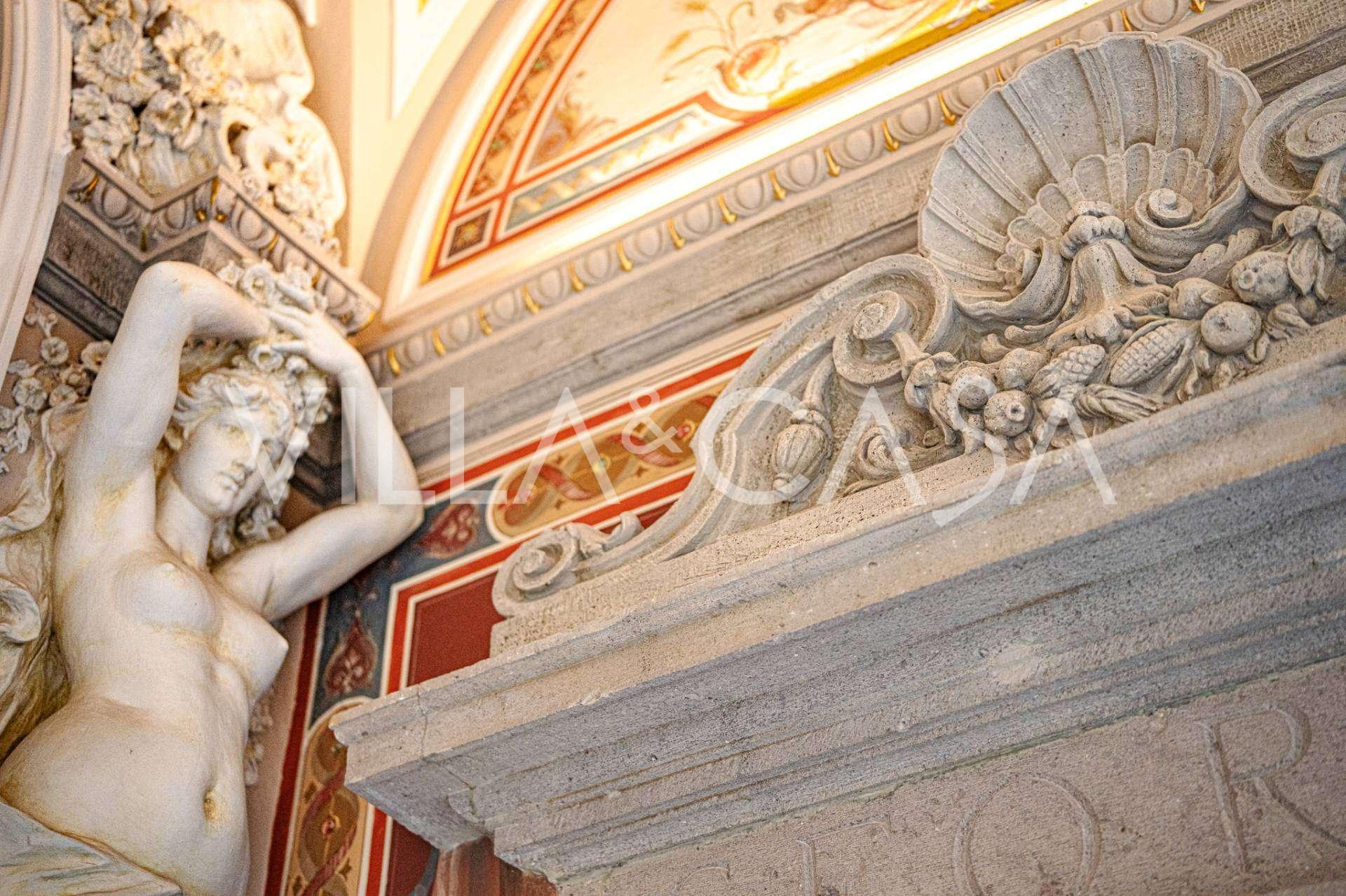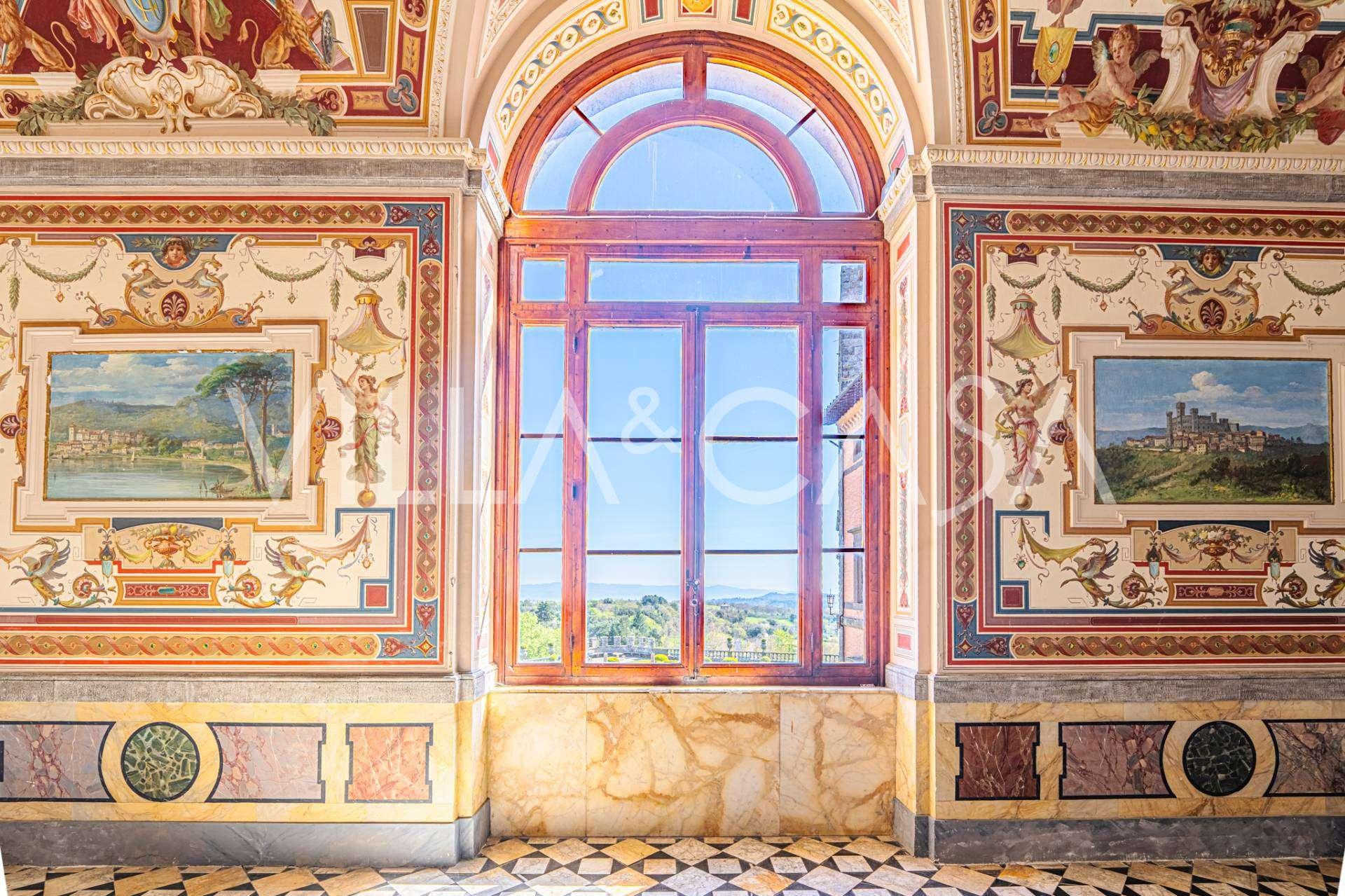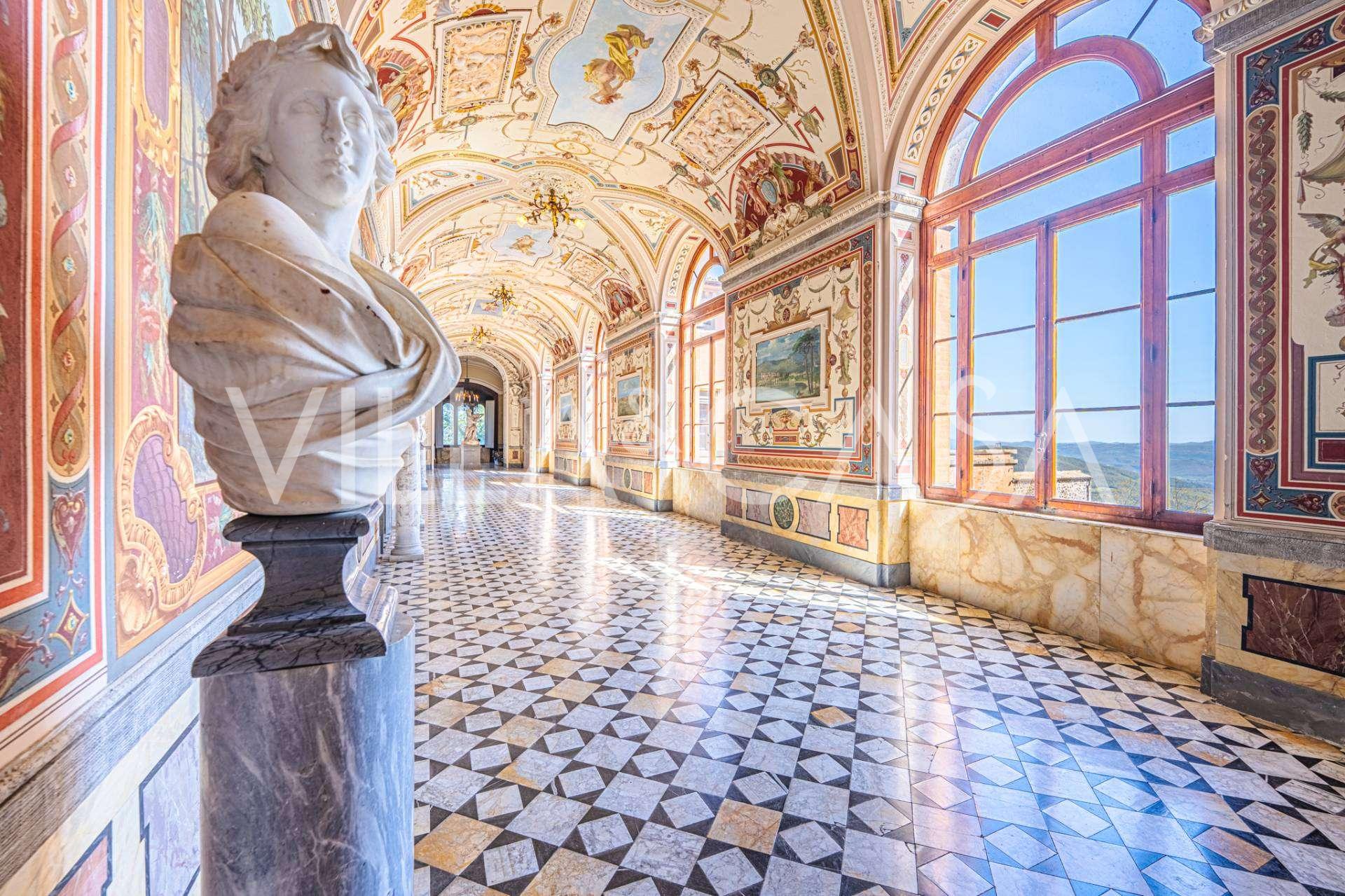 Når man træder ind i slottet, bliver man opslugt af en atmosfære af luksuriøse interiører. Her er marmorbelagte gulve, værdifulde fresker, hvælvede lofter, udsøgt vægdekoration og yndefulde statuer forenet i et harmonisk billede, der gengiver fortidens epoker i deres højeste manifestation. De storslåede værelser er udsmykket med elegante buer og enorme vinduer, der åbner op for betagende udsigter over de omkringliggende bakker.