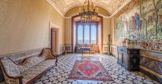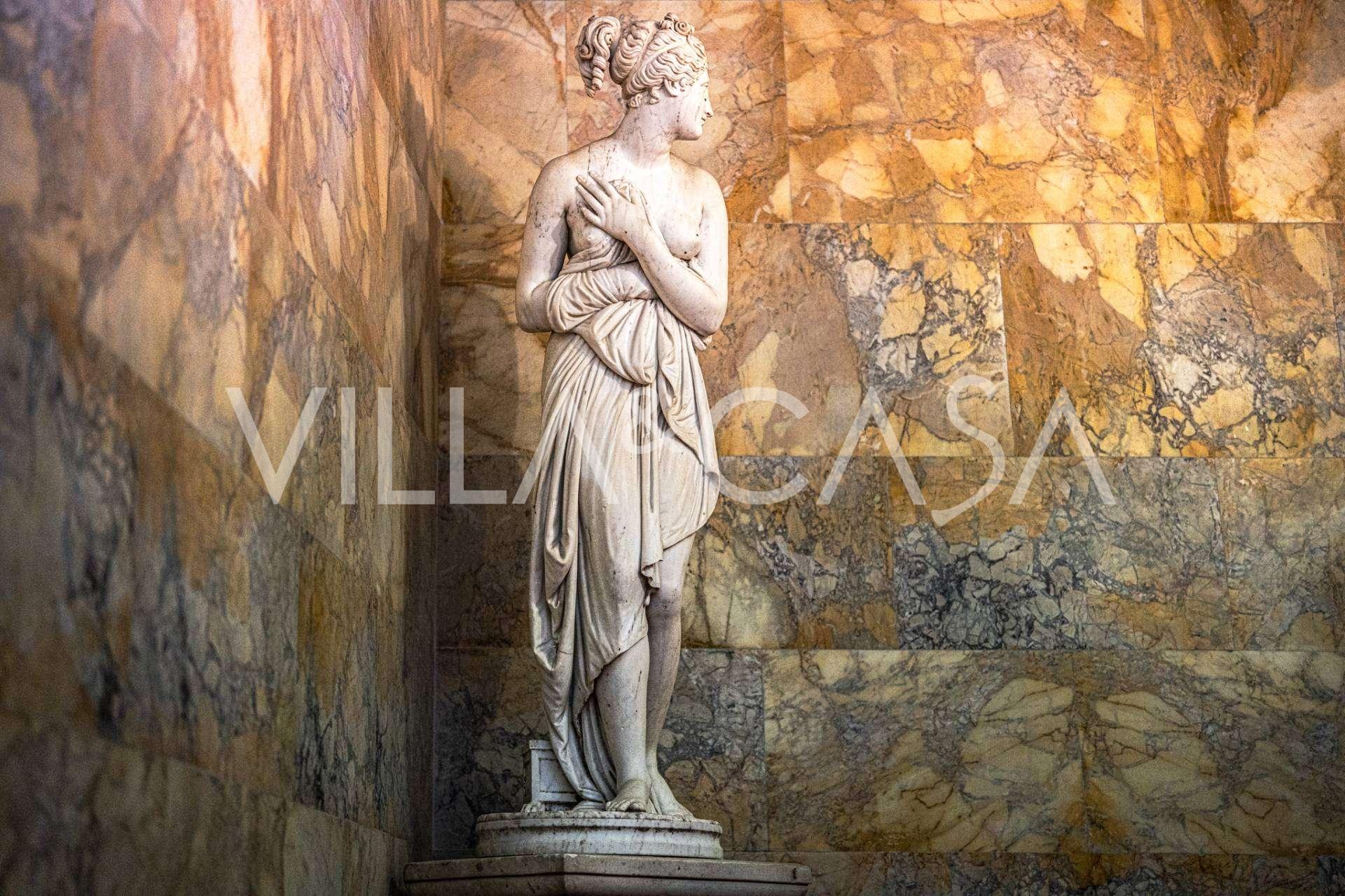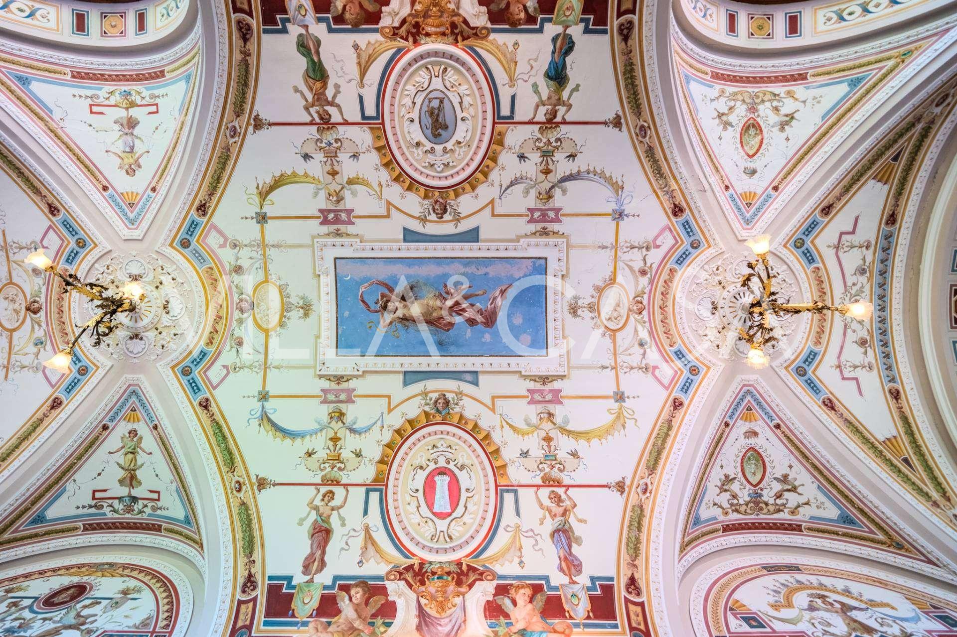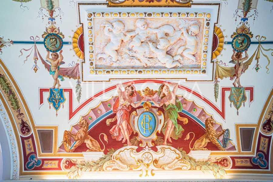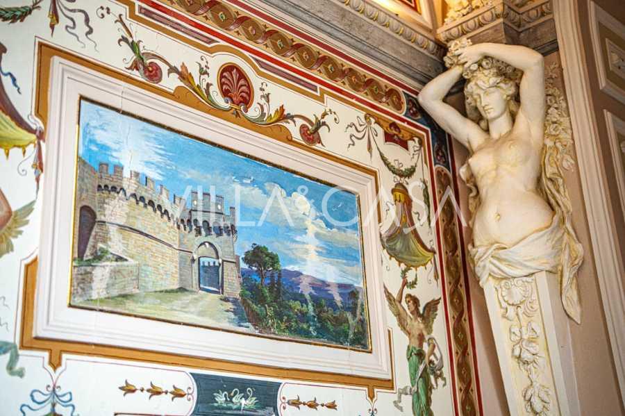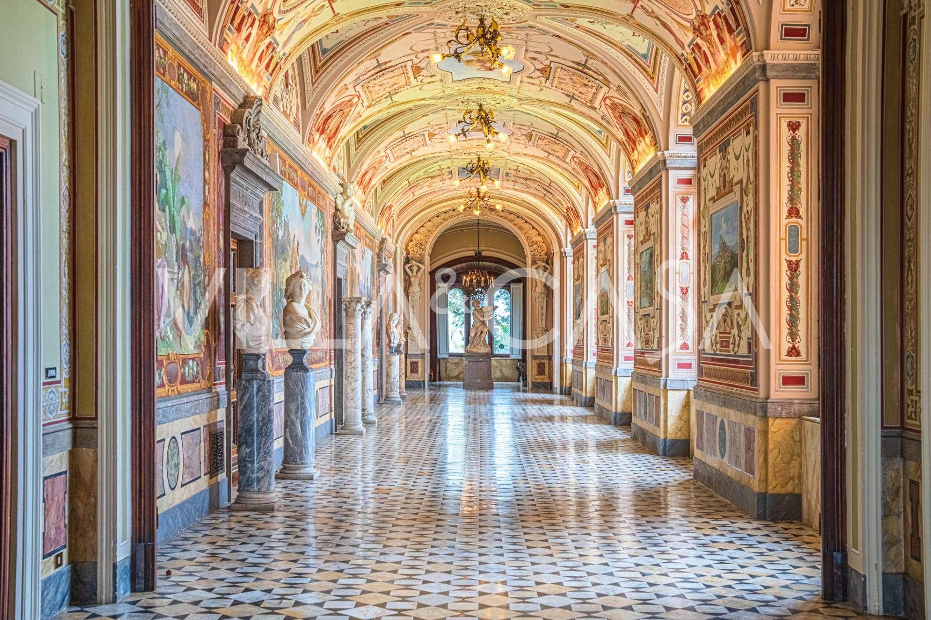 Når man træder ind i slottet, bliver man opslugt af en atmosfære af luksuriøse interiører. Her er marmorbelagte gulve, værdifulde fresker, hvælvede lofter, udsøgt vægdekoration og yndefulde statuer forenet i et harmonisk billede, der gengiver fortidens epoker i deres højeste manifestation. De storslåede værelser er udsmykket med elegante buer og enorme vinduer, der åbner op for betagende udsigter over de omkringliggende bakker.