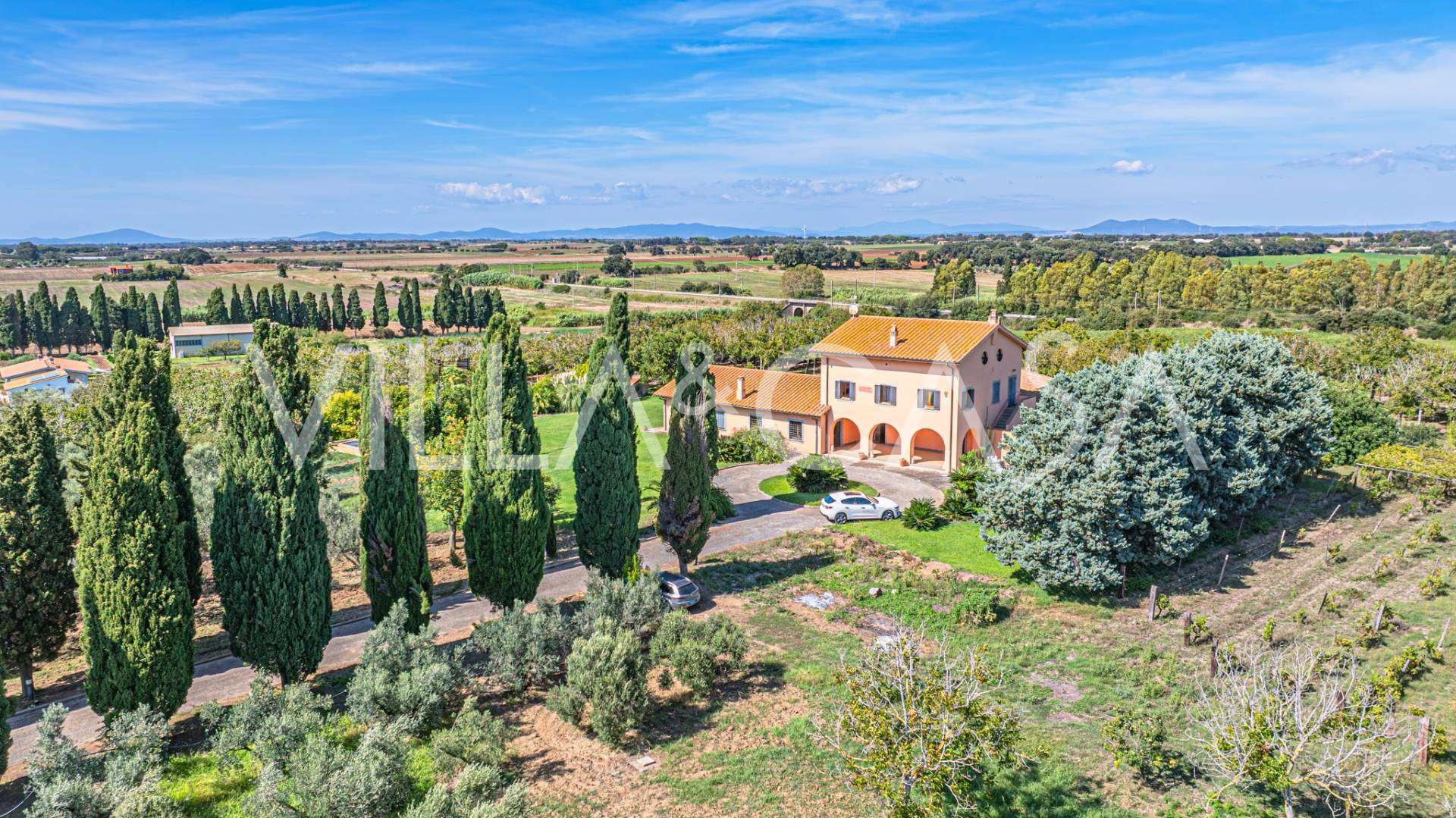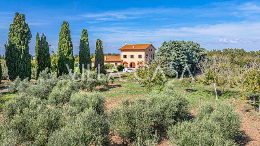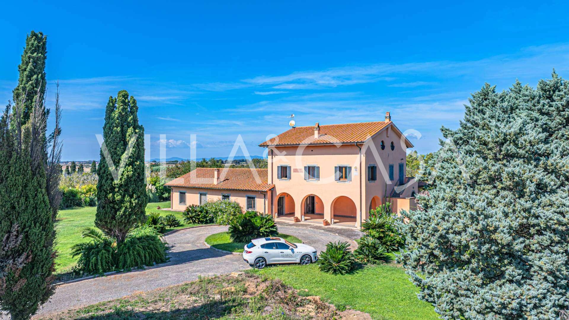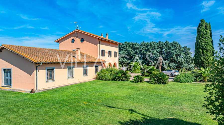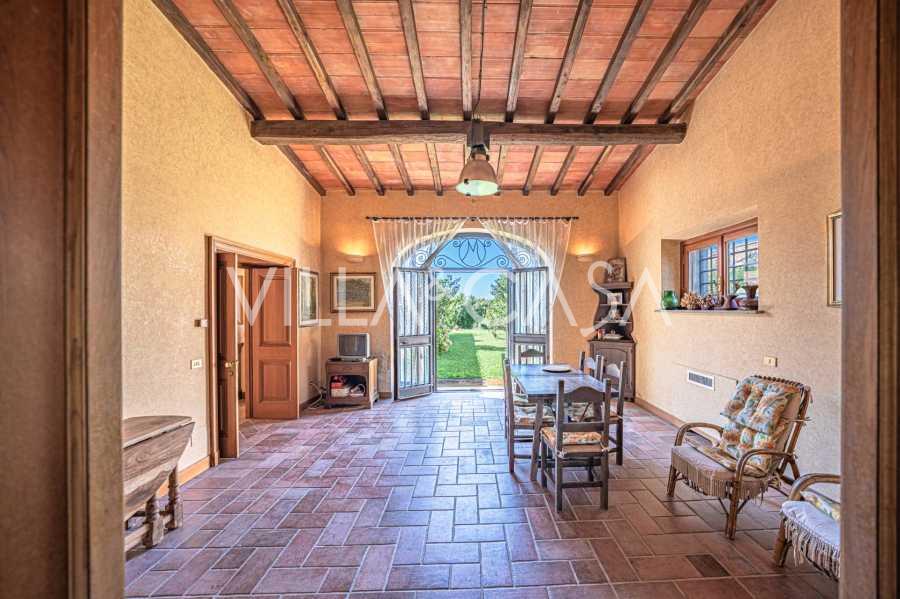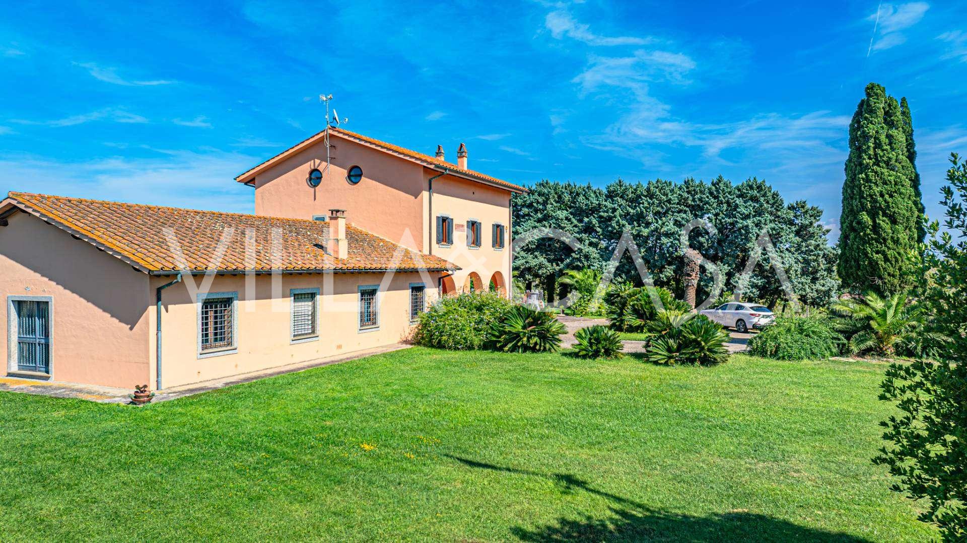 Der tilbydes et bondehus til salg, beliggende i et roligt område af Tarquinias landlige omgivelser, kun få hundrede meter fra havet, som kan ses smukt fra de øverste etager. Huset har nem adgang til bymiljøet og kystområdet. Bygget i 1942, blev det fuldstændig renoveret i 1990'erne med brug af traditionelle materialer af højeste kvalitet og møbleret med håndlavede designermøbler. Huset ligger på en grund på over to hektar, omgivet af en pragtfuld have med forskellige planter: frugttræer, palmer, oliventræer, nødder, en vingård, tropisk flora, buske, rosenhaver og frodige blomster.