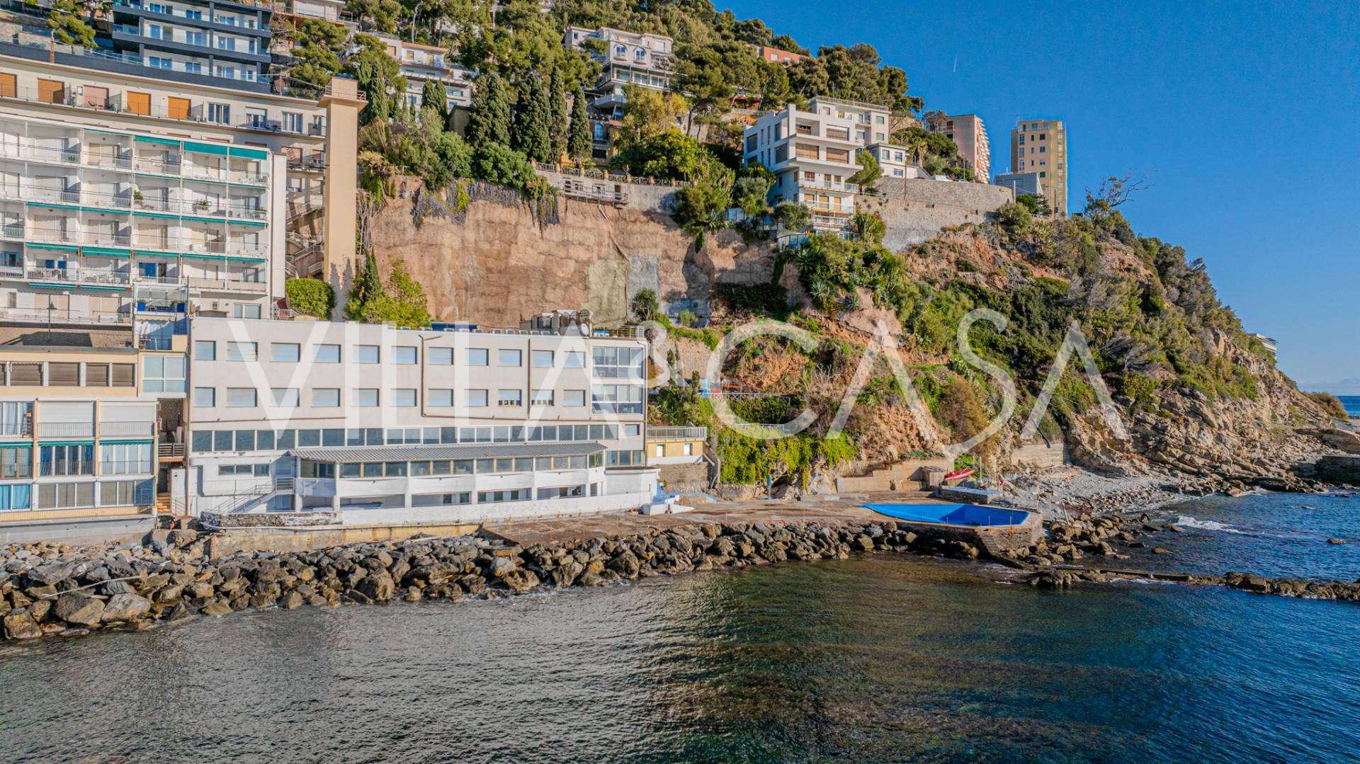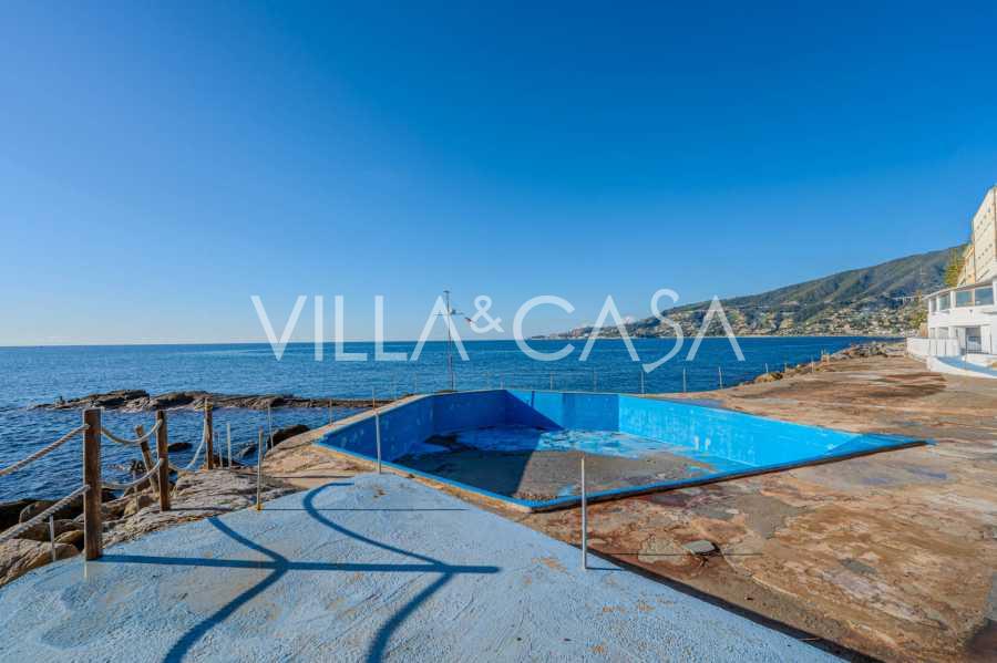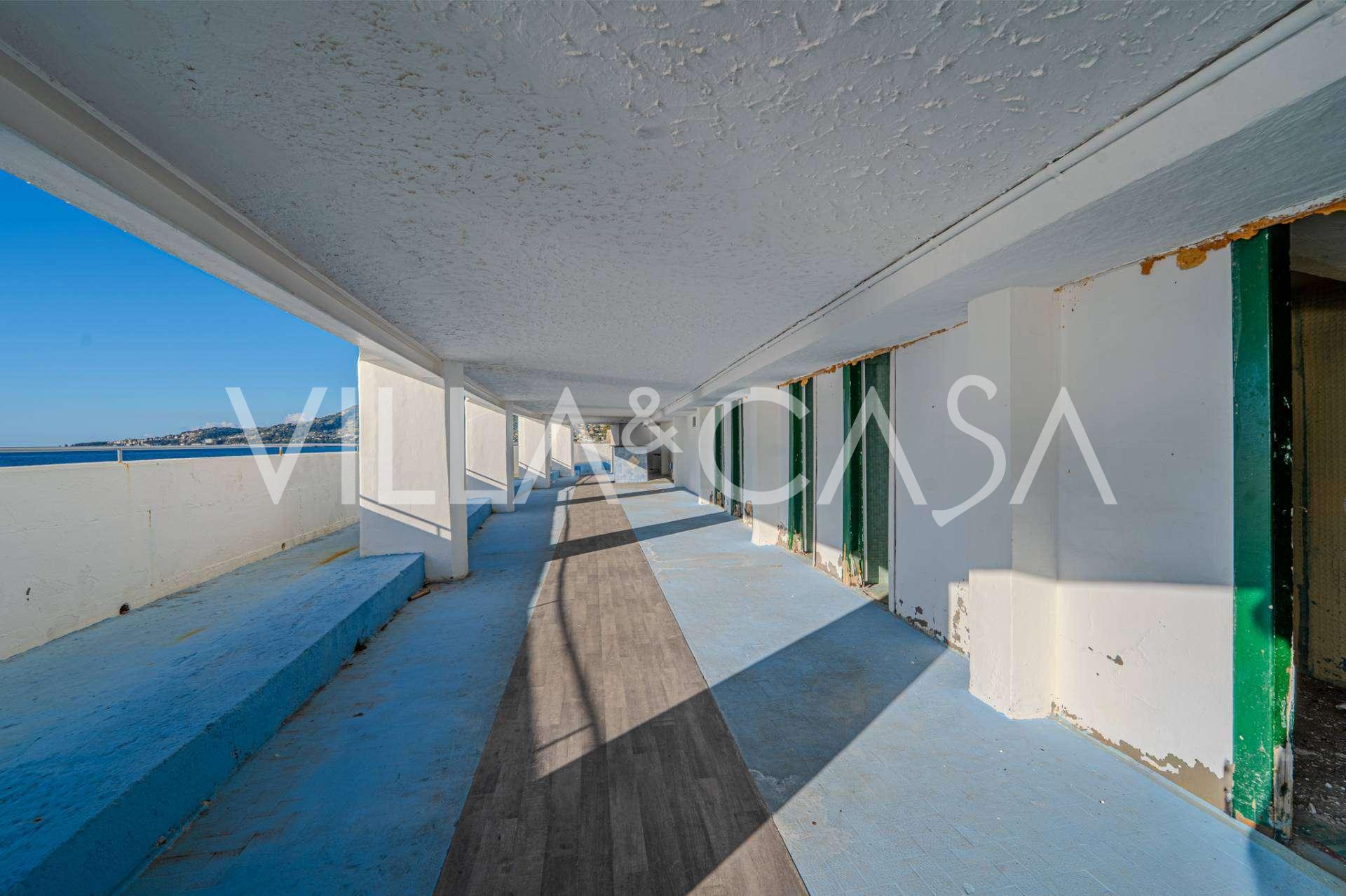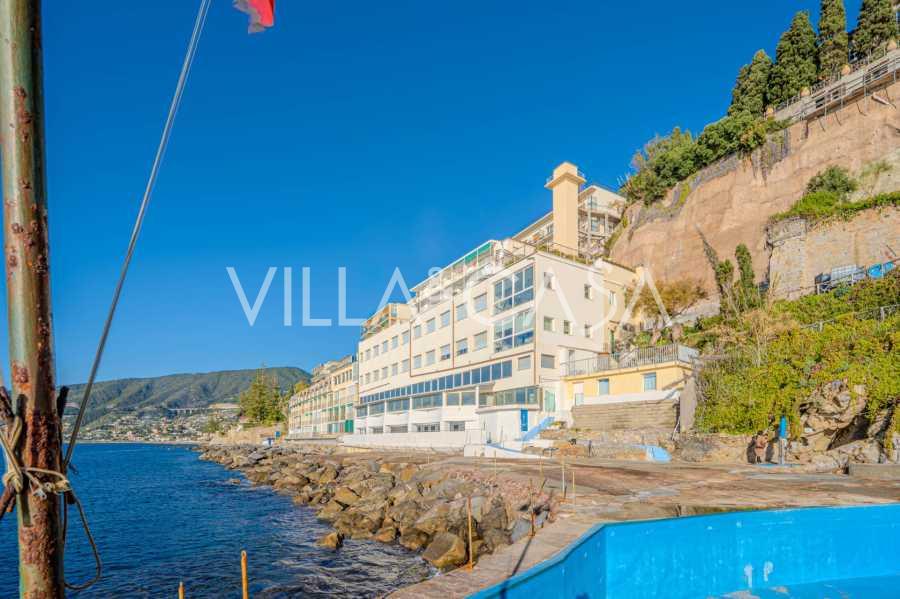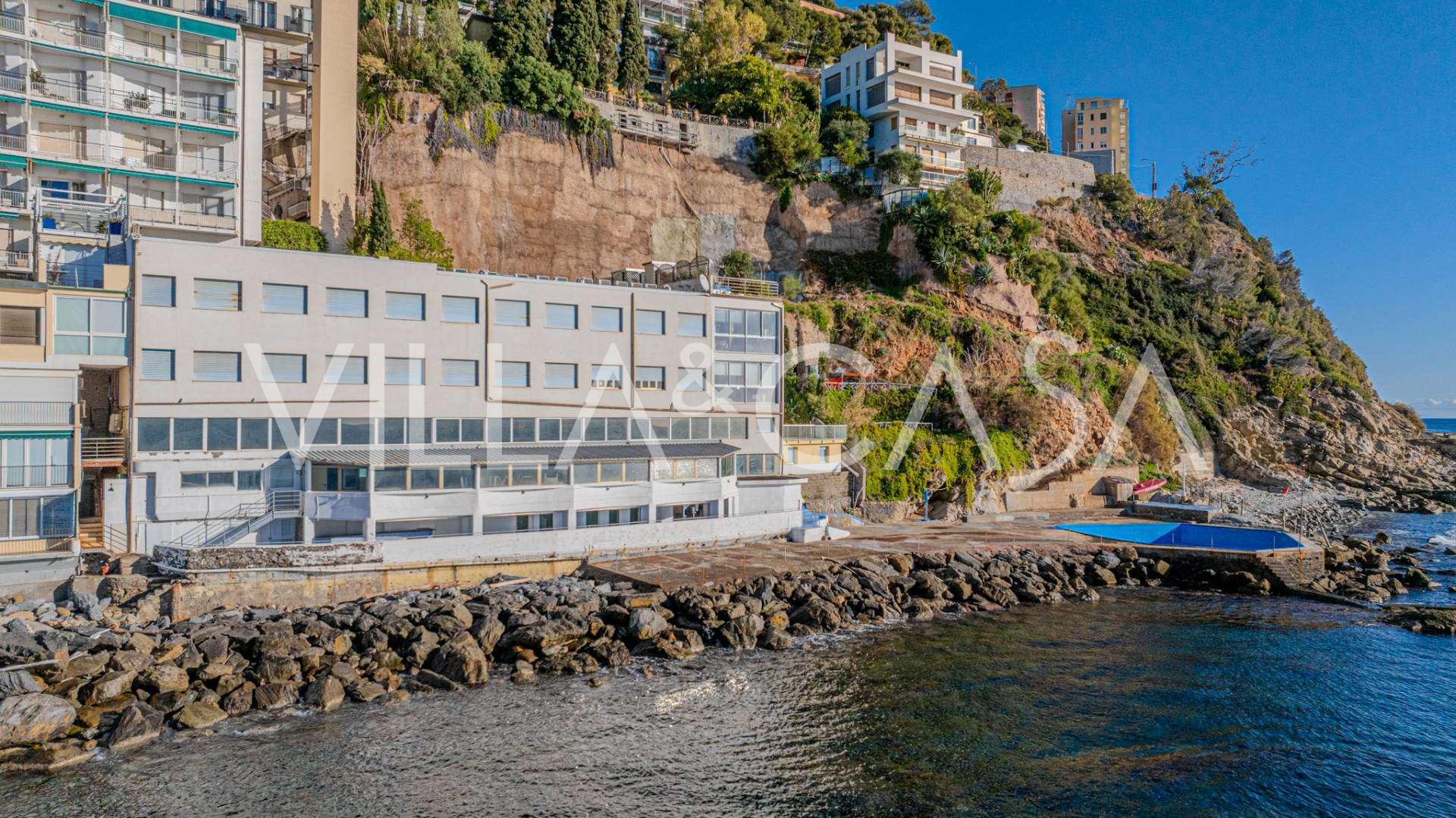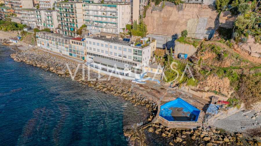 En unik hotel i Ospedaletti er til salg, beliggende på en privilegeret placering ved kysten med direkte adgang til havet og sin egen strand. Herfra er der en fantastisk panoramaudsigt over havets overflade. På klare dage kan man se en del af den Franske Riviera og Lerins-øerne, og i vintermånederne ved daggry kan man skimte Korsika.