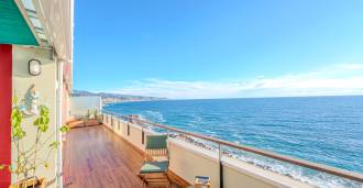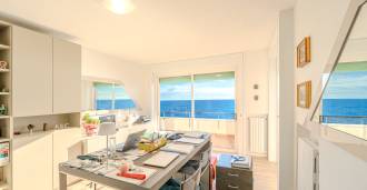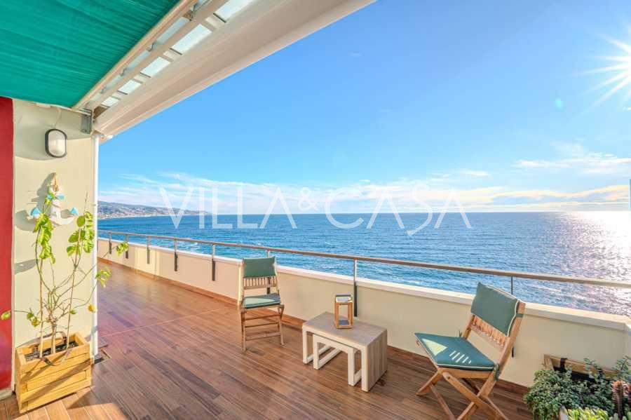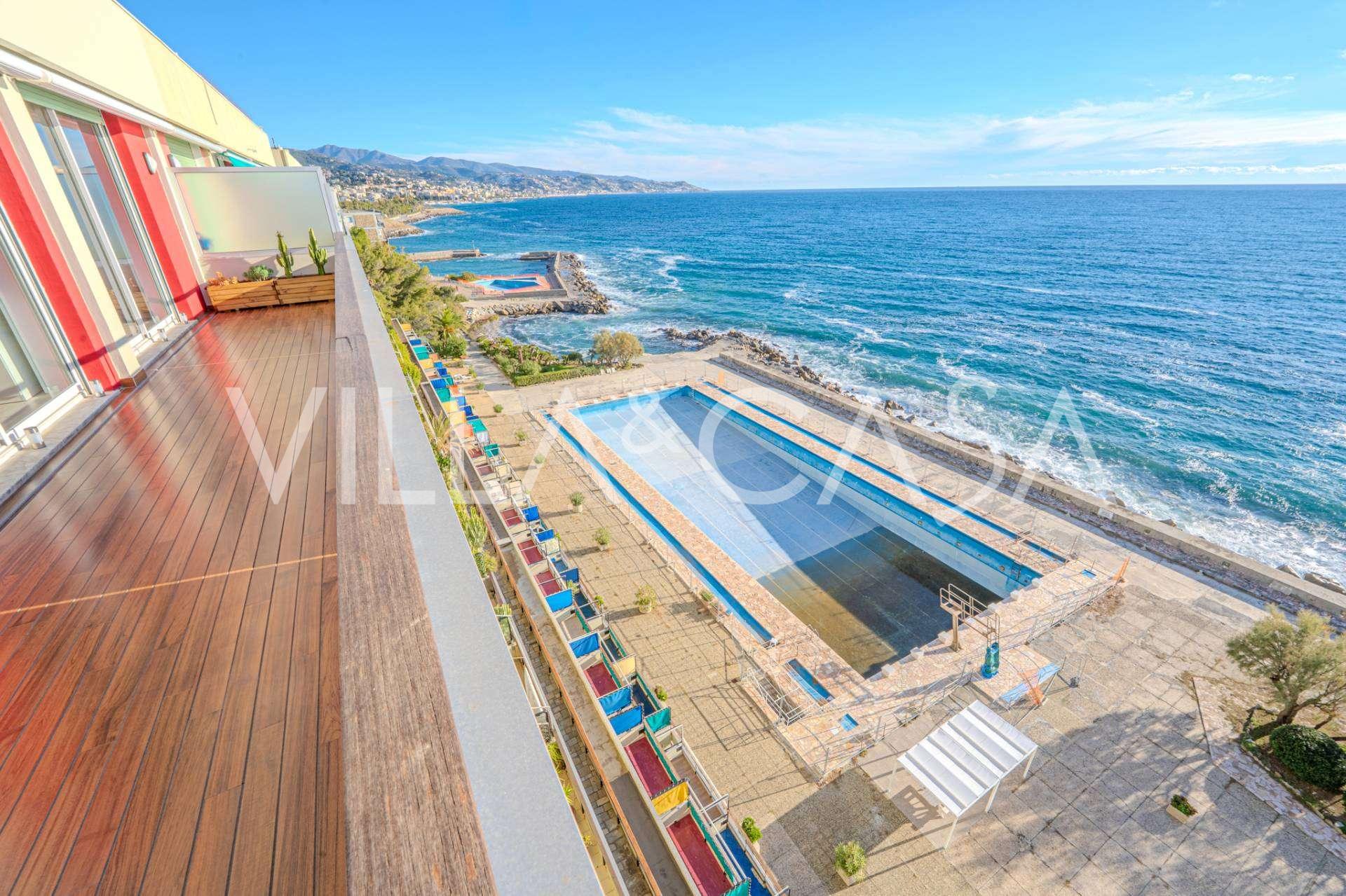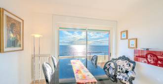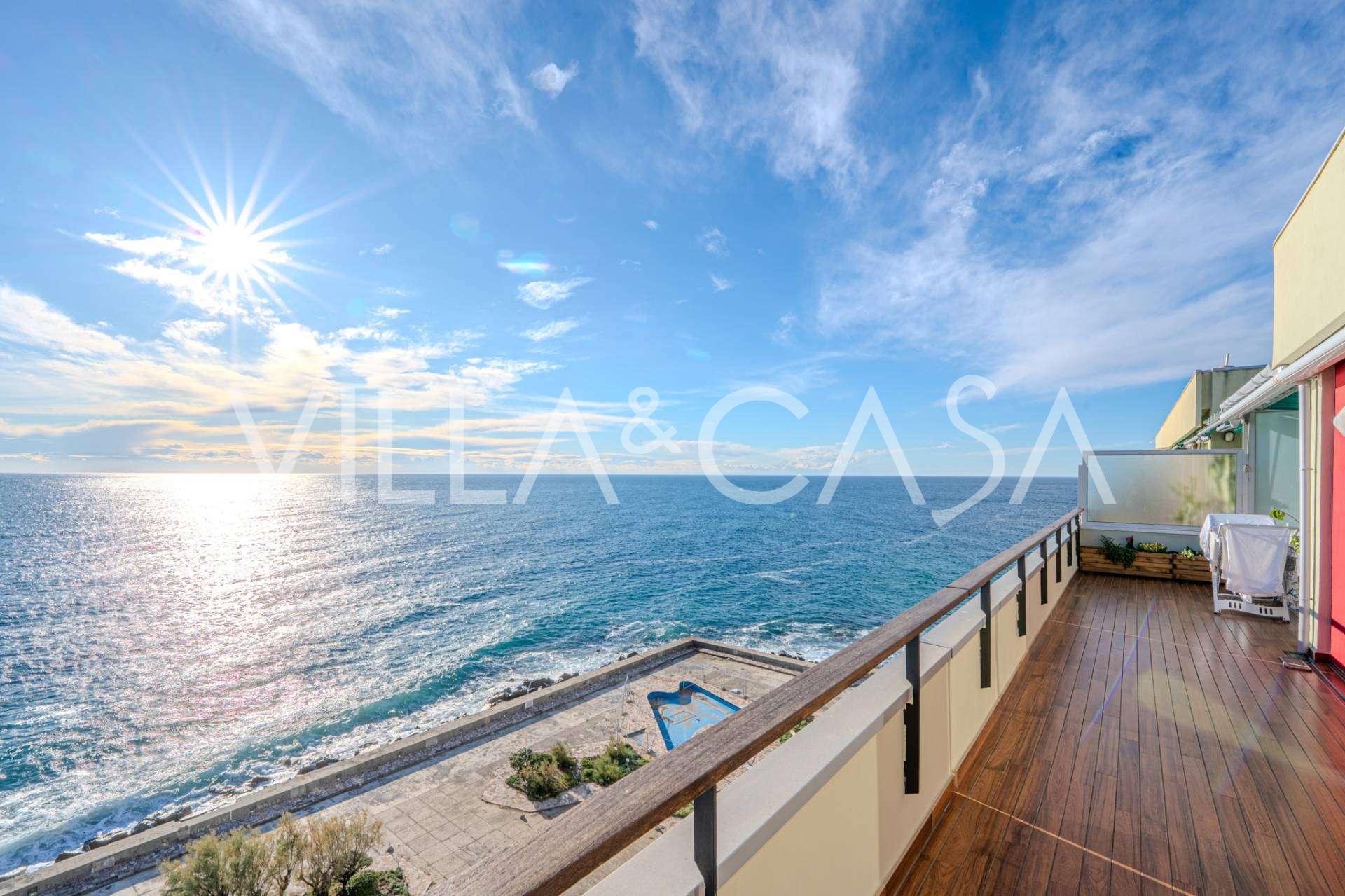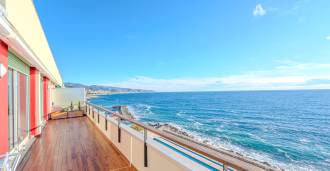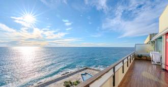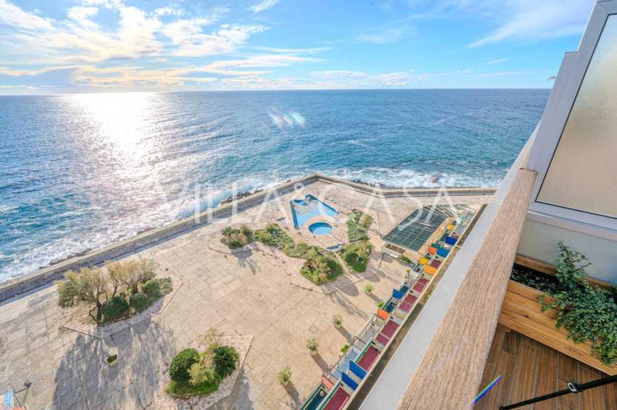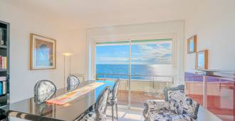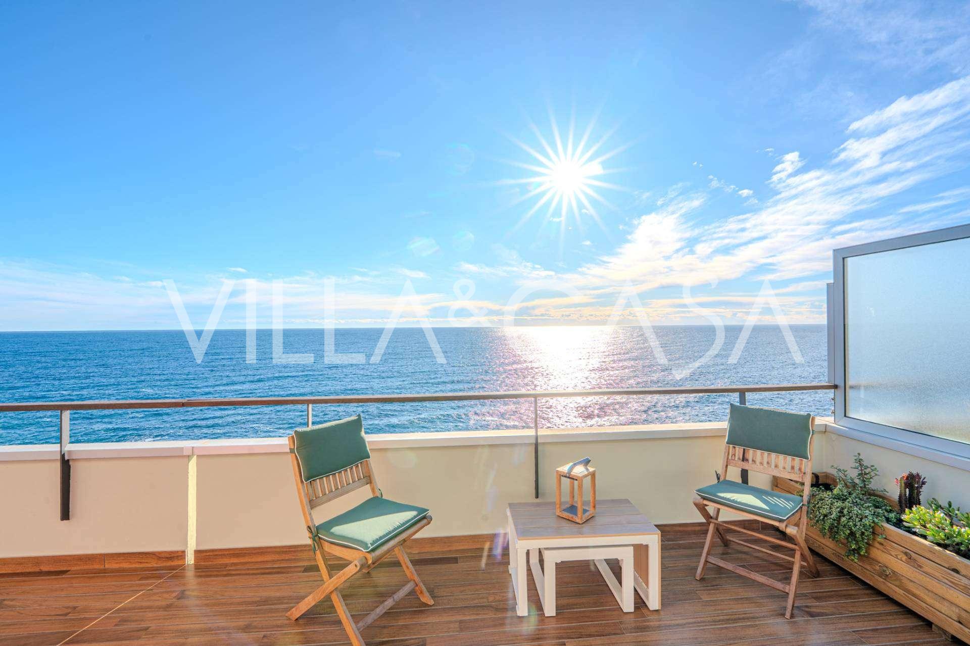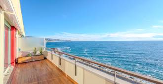En penthouse med en rummelig terrasse på 143 m² (123 m² boligareal + 20 m² garage) tilbydes direkte ved havet. Den elegante penthouse, fuldstændig renoveret i 2023, er beliggende på 5. sal i en bygning med concierge. Lejligheden er orienteret mod sydøst og har en stor terrasse, der skaber en lys og hyggelig atmosfære.