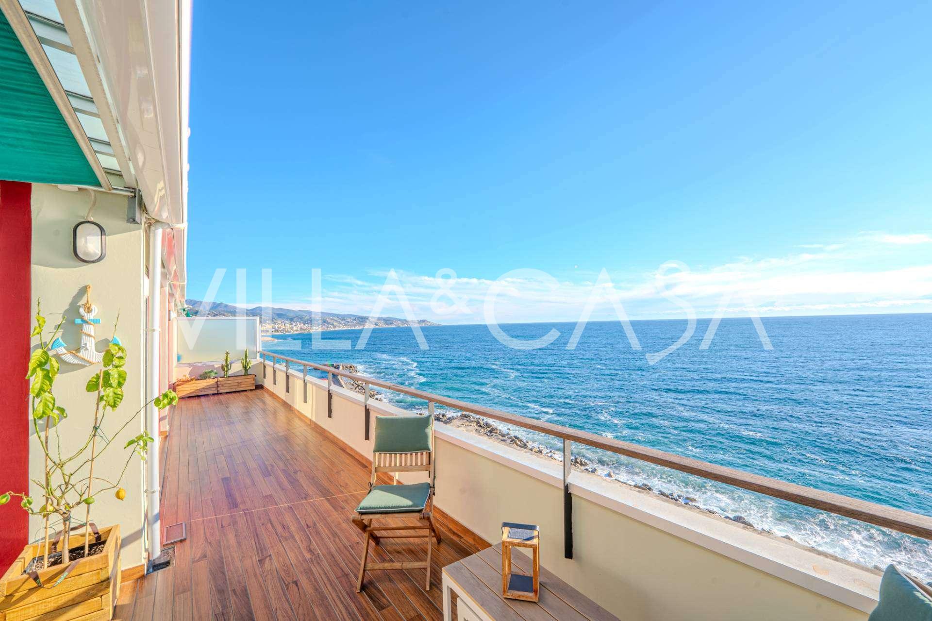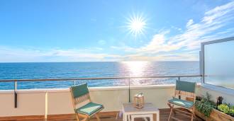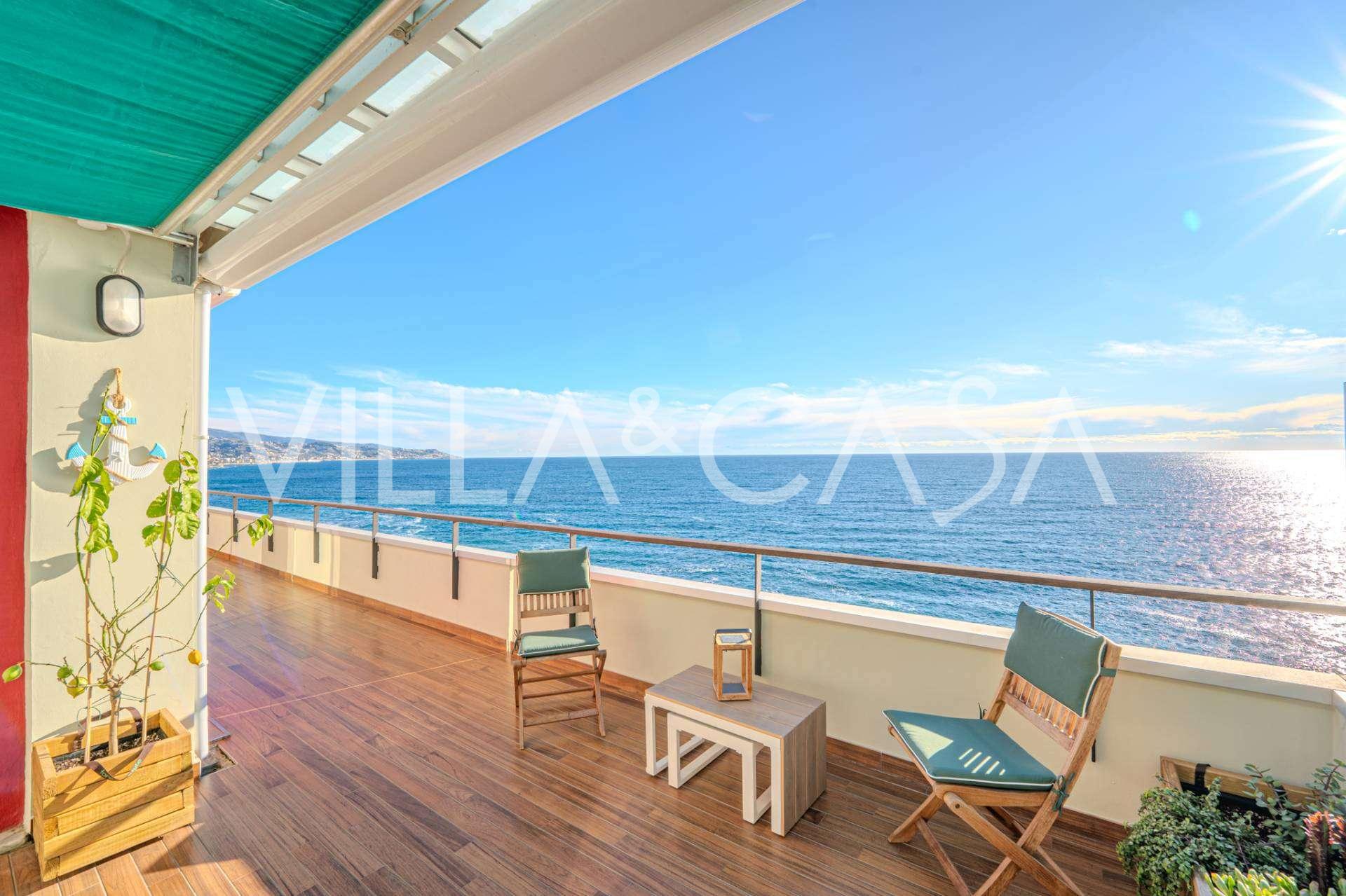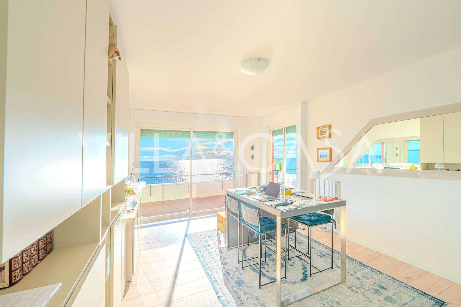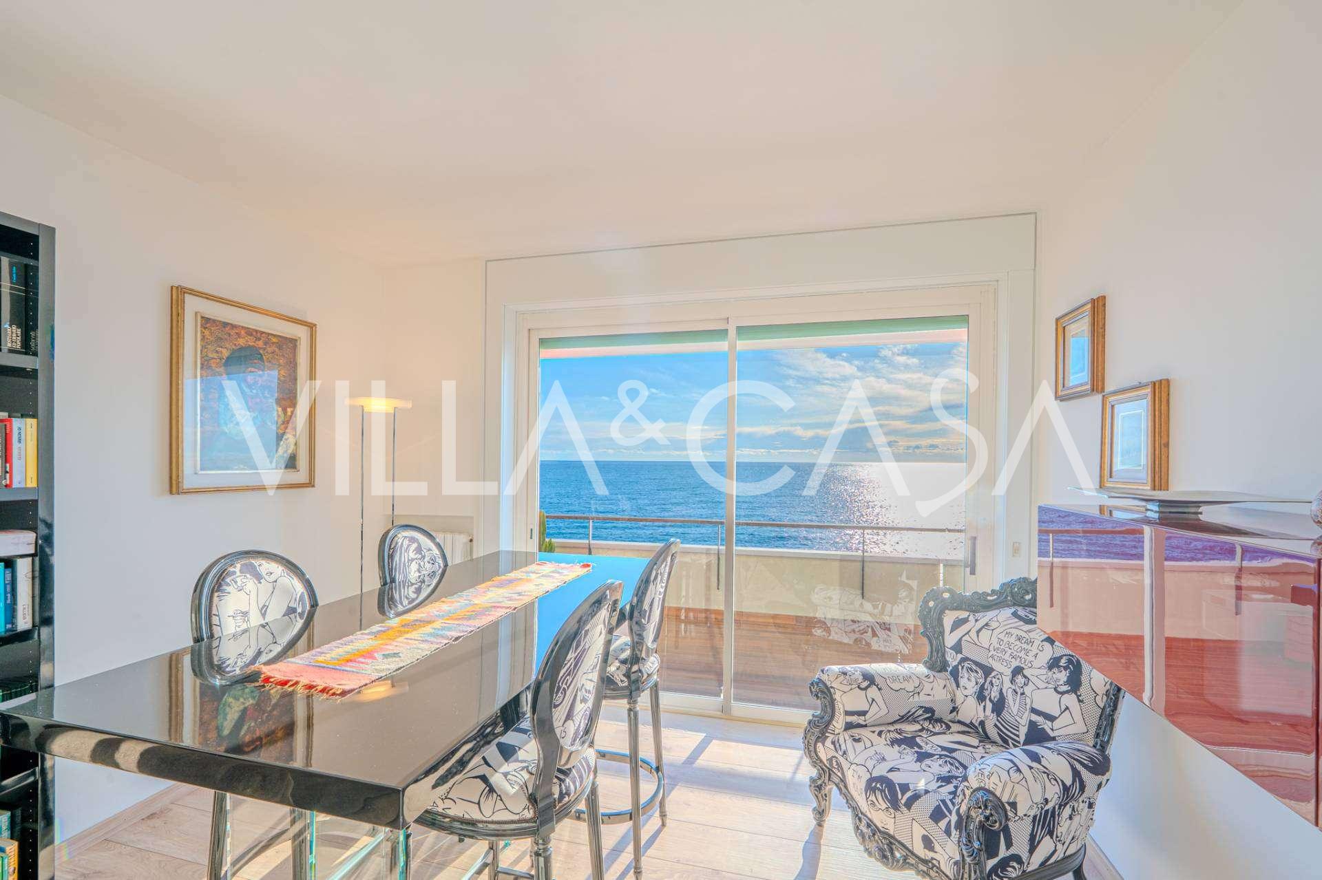 En penthouse med en rummelig terrasse på 143 m² (123 m² boligareal + 20 m² garage) tilbydes direkte ved havet. Den elegante penthouse, fuldstændig renoveret i 2023, er beliggende på 5. sal i en bygning med concierge. Lejligheden er orienteret mod sydøst og har en stor terrasse, der skaber en lys og hyggelig atmosfære.