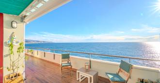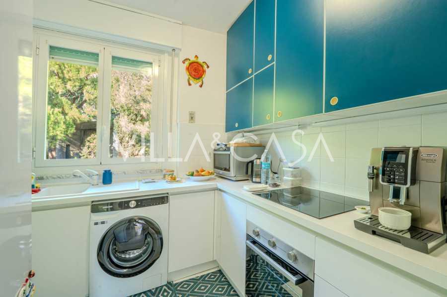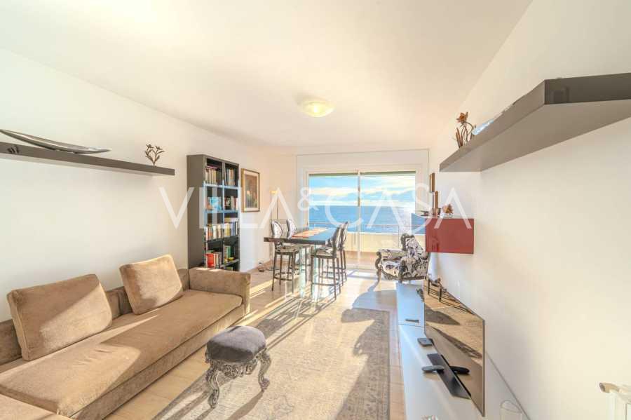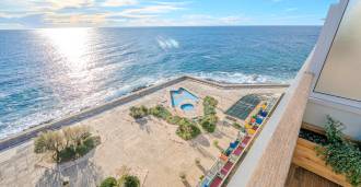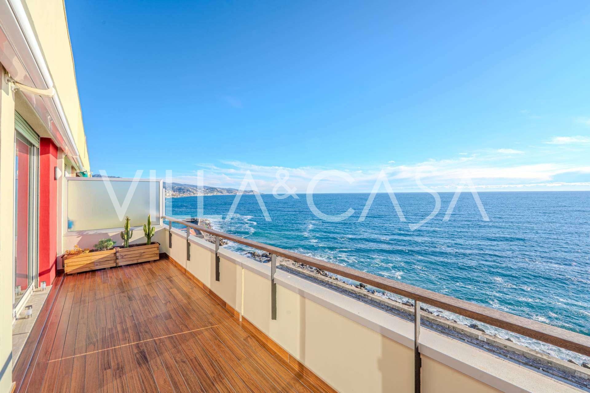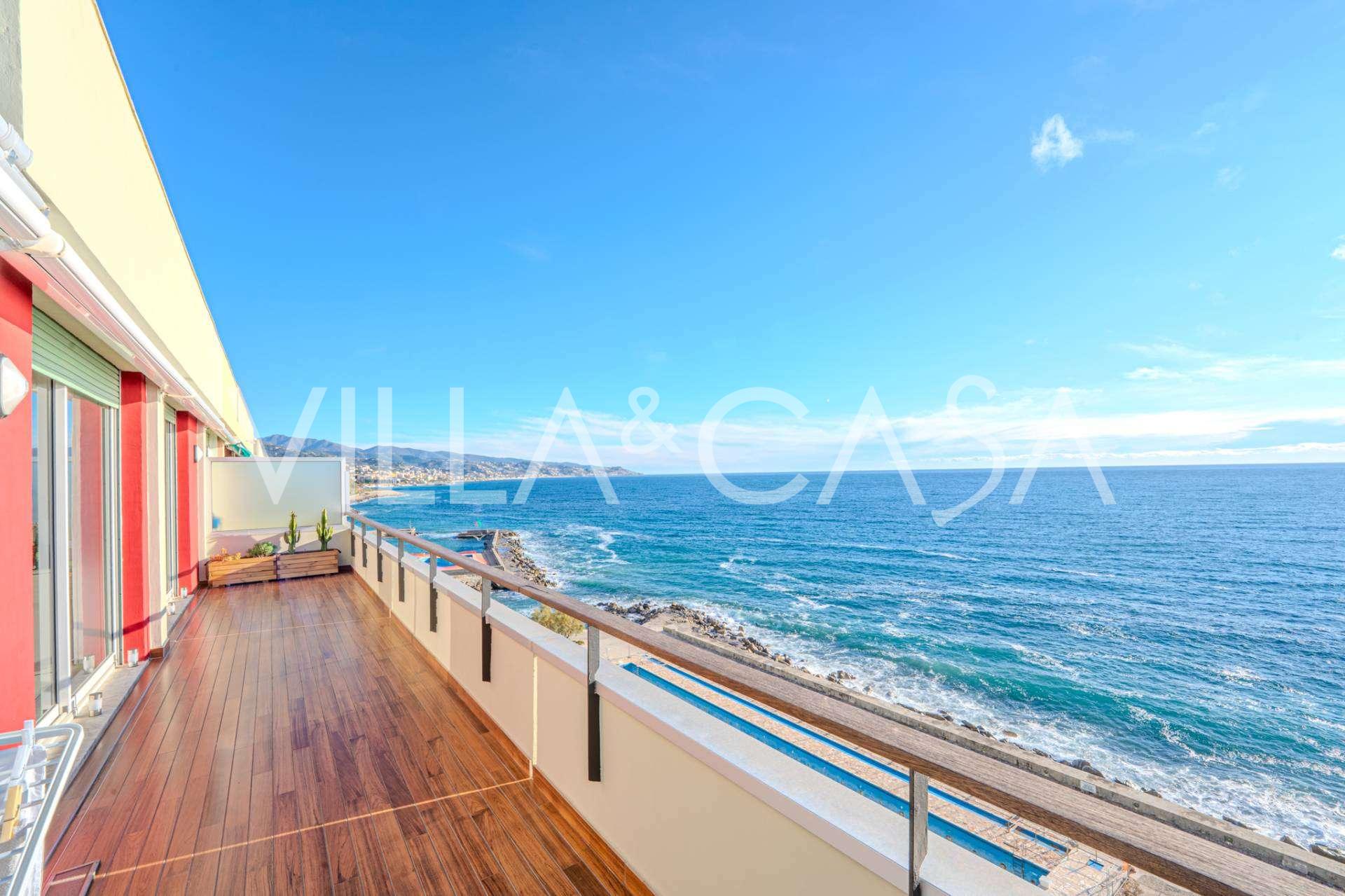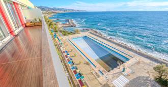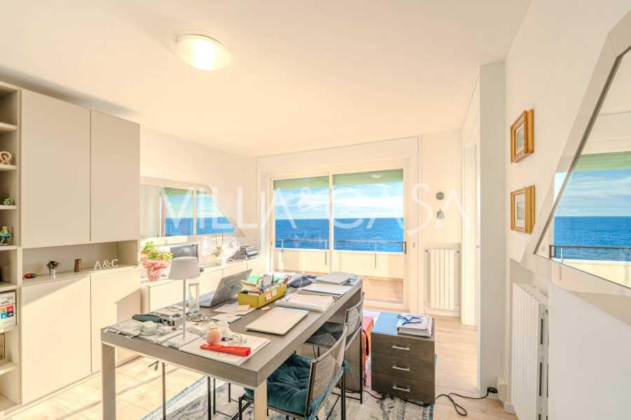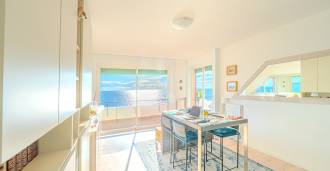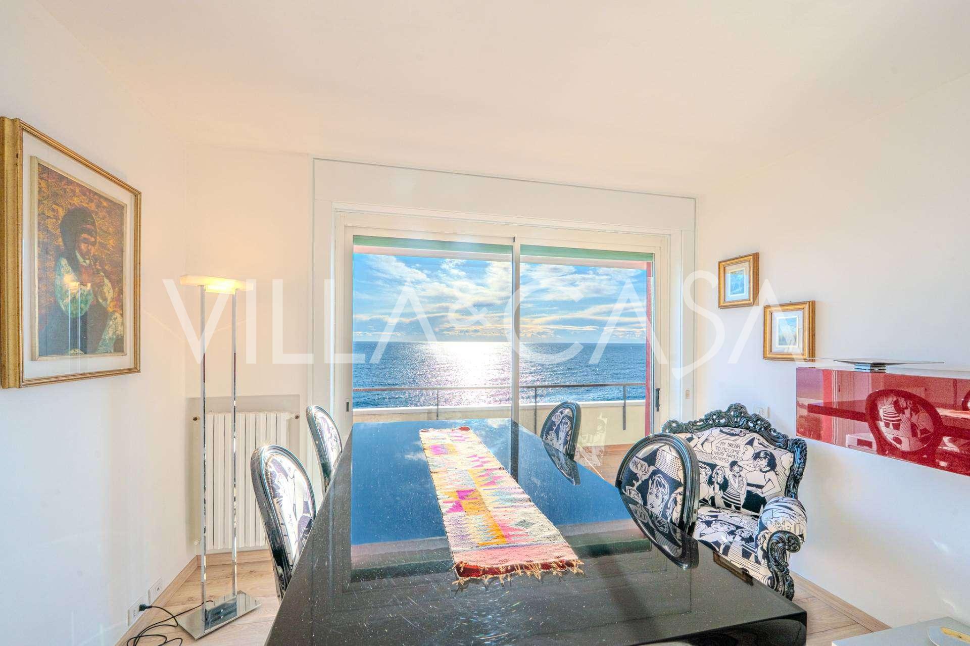 En penthouse med en rummelig terrasse på 143 m² (123 m² boligareal + 20 m² garage) tilbydes direkte ved havet. Den elegante penthouse, fuldstændig renoveret i 2023, er beliggende på 5. sal i en bygning med concierge. Lejligheden er orienteret mod sydøst og har en stor terrasse, der skaber en lys og hyggelig atmosfære.