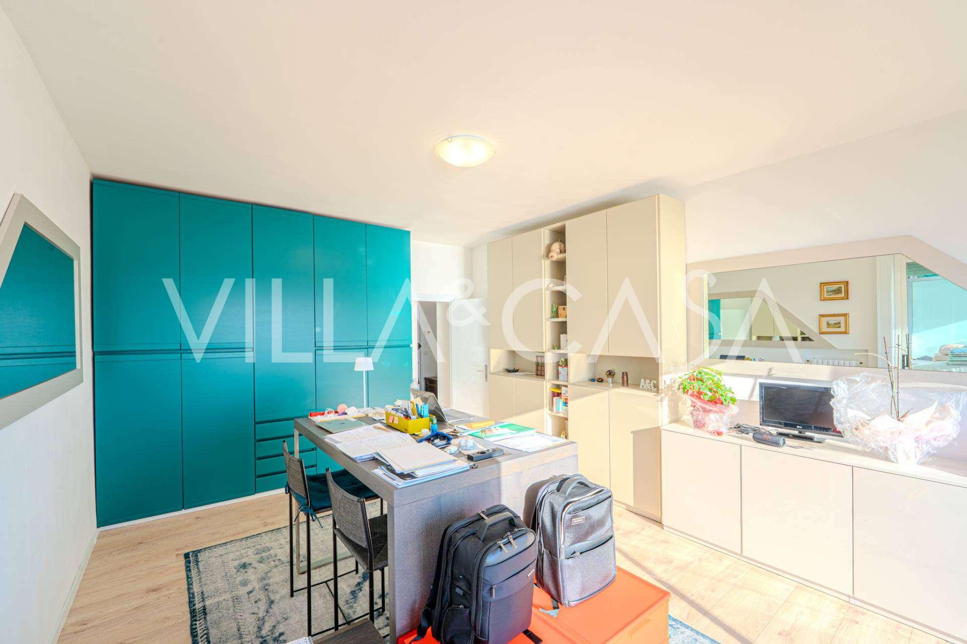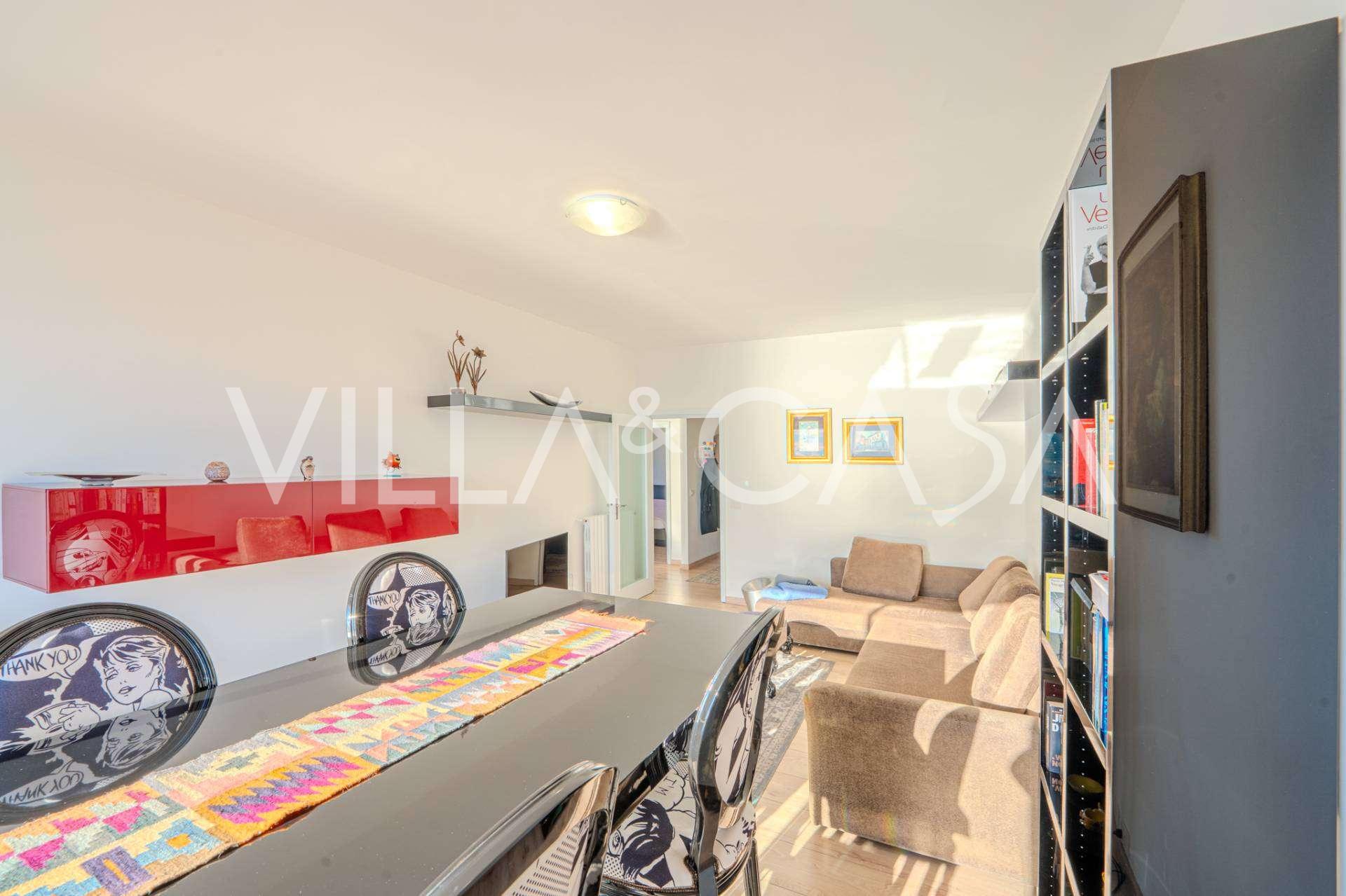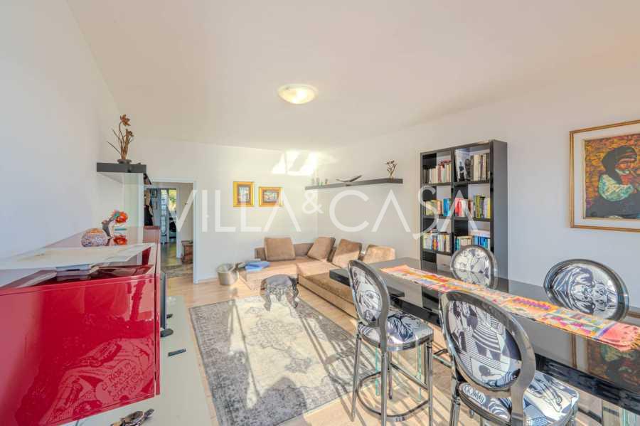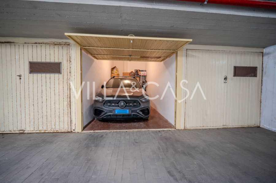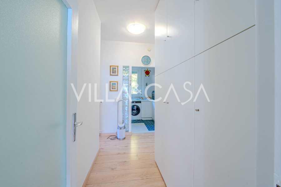 Indretningen inkluderer: stue, kontor, to soveværelser, hvoraf det ene har havudsigt, køkken-alrum, to badeværelser med vinduer, entré og gang. Der er autonom opvarmning, mulighed for installation af aircondition, en garage-boks på 20 m² med en loftshøjde på 3,50 m og mulighed for at lave en hems, samt en rummelig terrasse til afslapning. Der er ingen kælder, men garagen kompenserer for opbevaring. Fællesudgifterne udgør 2000 € om året.