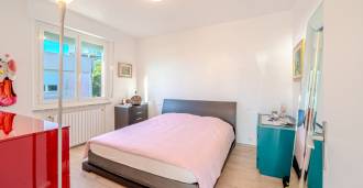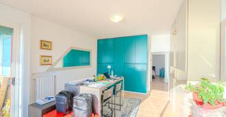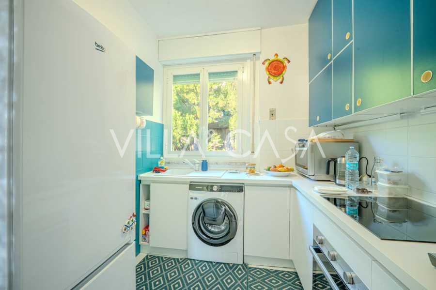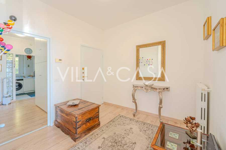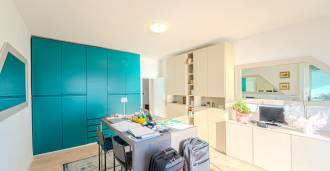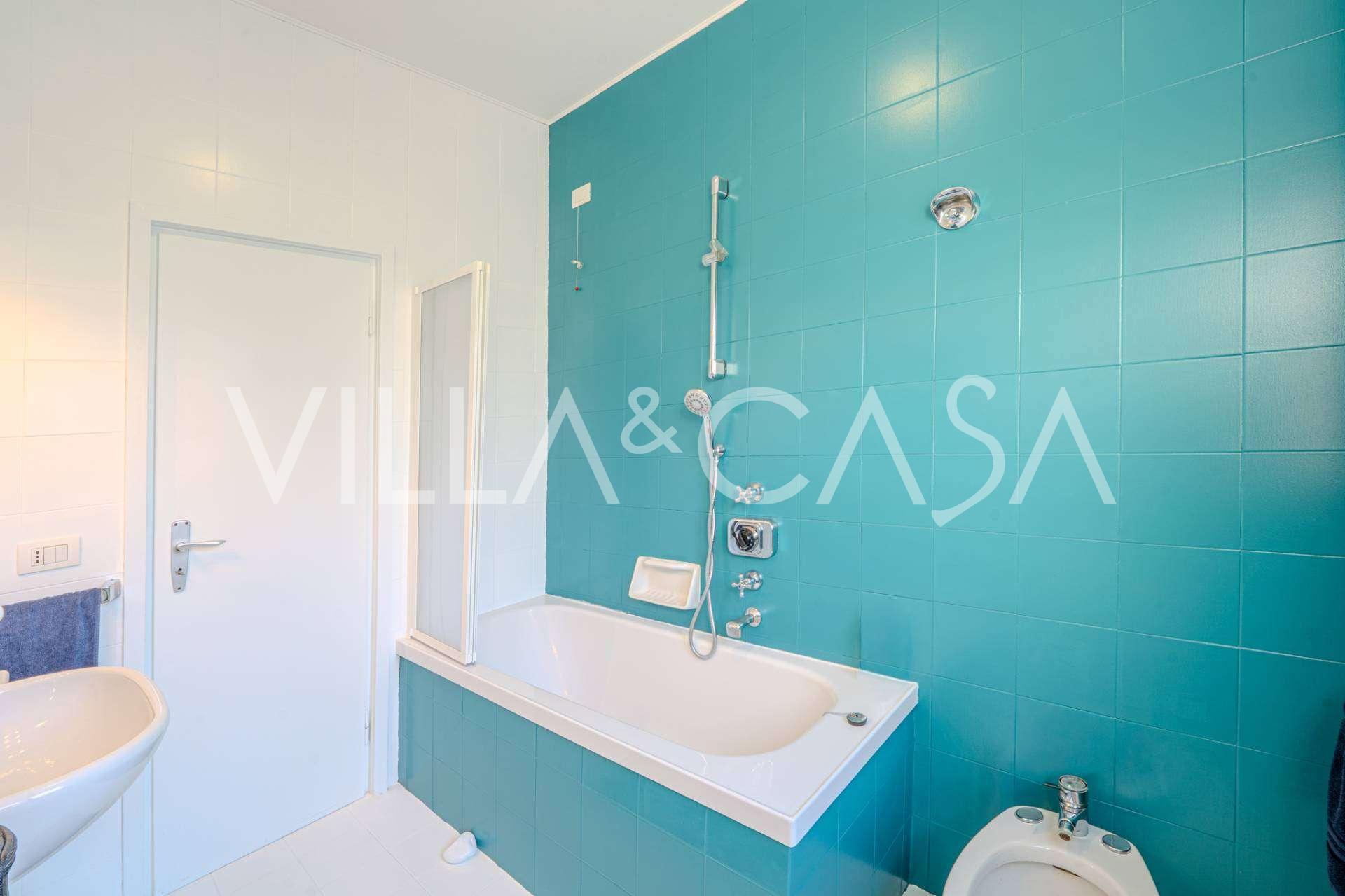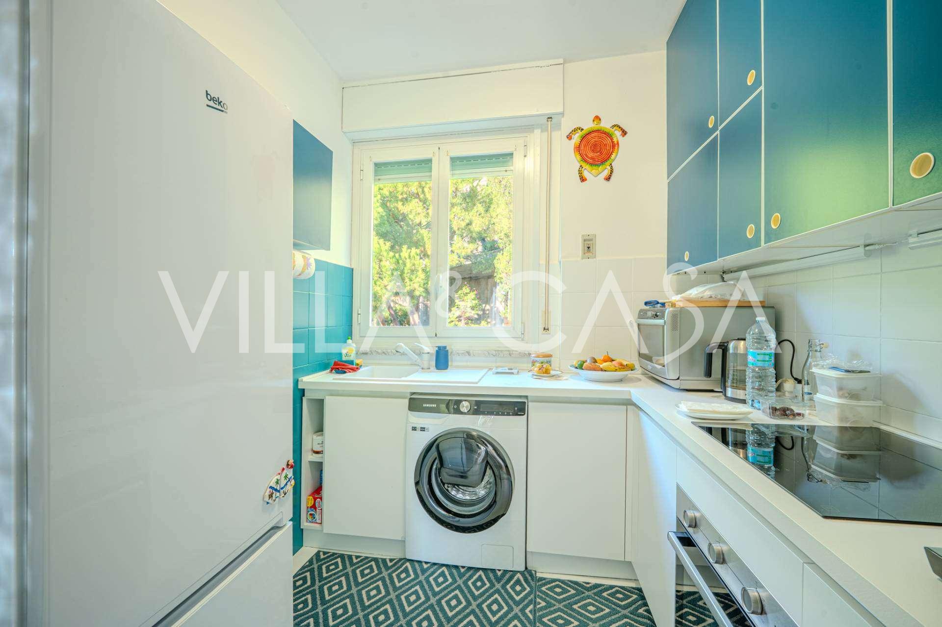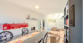 Indretningen inkluderer: stue, kontor, to soveværelser, hvoraf det ene har havudsigt, køkken-alrum, to badeværelser med vinduer, entré og gang. Der er autonom opvarmning, mulighed for installation af aircondition, en garage-boks på 20 m² med en loftshøjde på 3,50 m og mulighed for at lave en hems, samt en rummelig terrasse til afslapning. Der er ingen kælder, men garagen kompenserer for opbevaring. Fællesudgifterne udgør 2000 € om året.