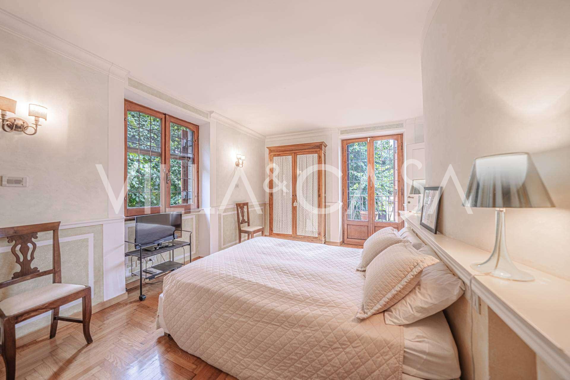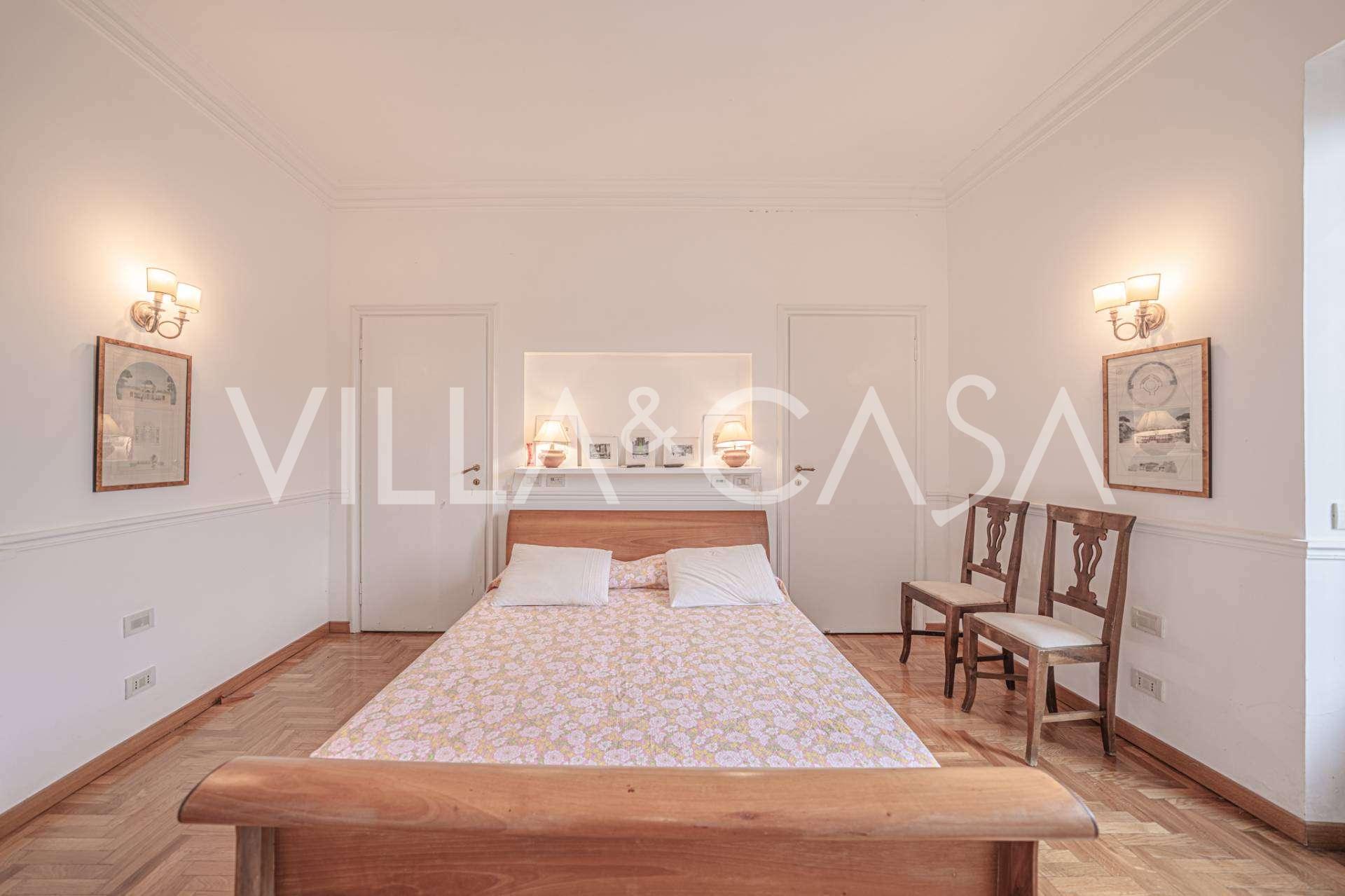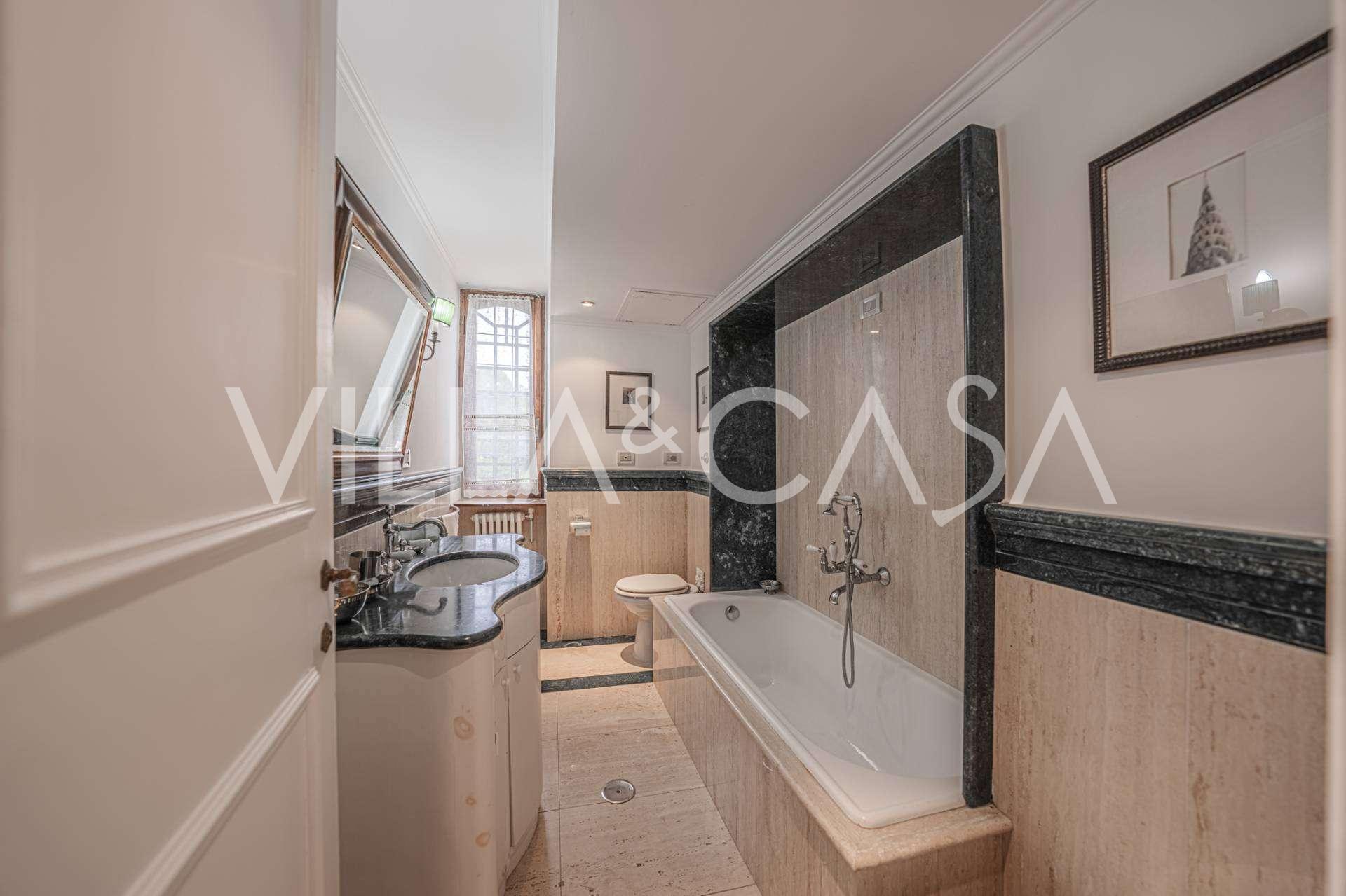 På det andet niveau af tårnet findes hovedsoveværelset med panoramaudsigt over parken på 180 grader, to garderober, en korridor med elegante skabe og en møbleret terrasse. Fra soveværelset er der direkte adgang til det luksuriøse badeværelse i Carrara-marmor med jacuzzi – det perfekte sted for en afsondret afslapning.