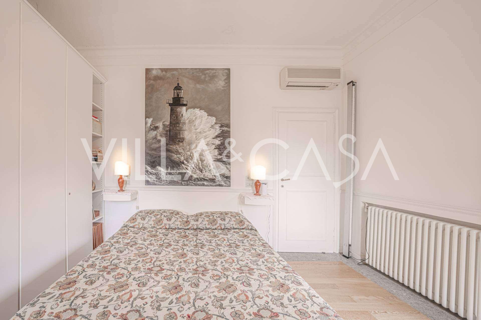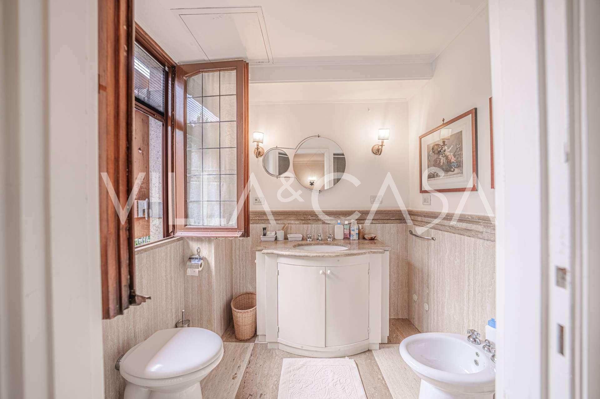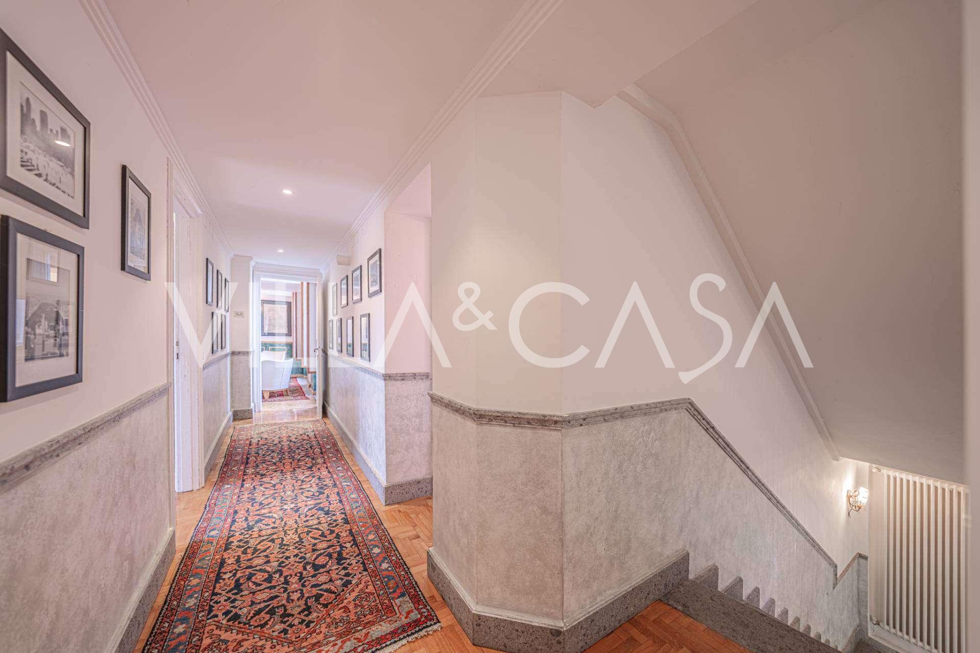 På det andet niveau af tårnet findes hovedsoveværelset med panoramaudsigt over parken på 180 grader, to garderober, en korridor med elegante skabe og en møbleret terrasse. Fra soveværelset er der direkte adgang til det luksuriøse badeværelse i Carrara-marmor med jacuzzi – det perfekte sted for en afsondret afslapning.