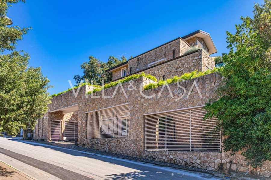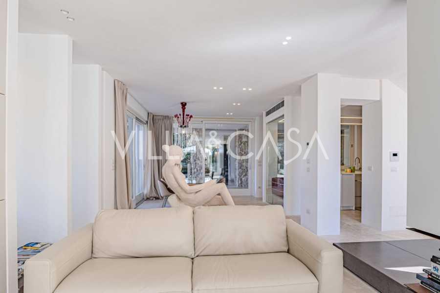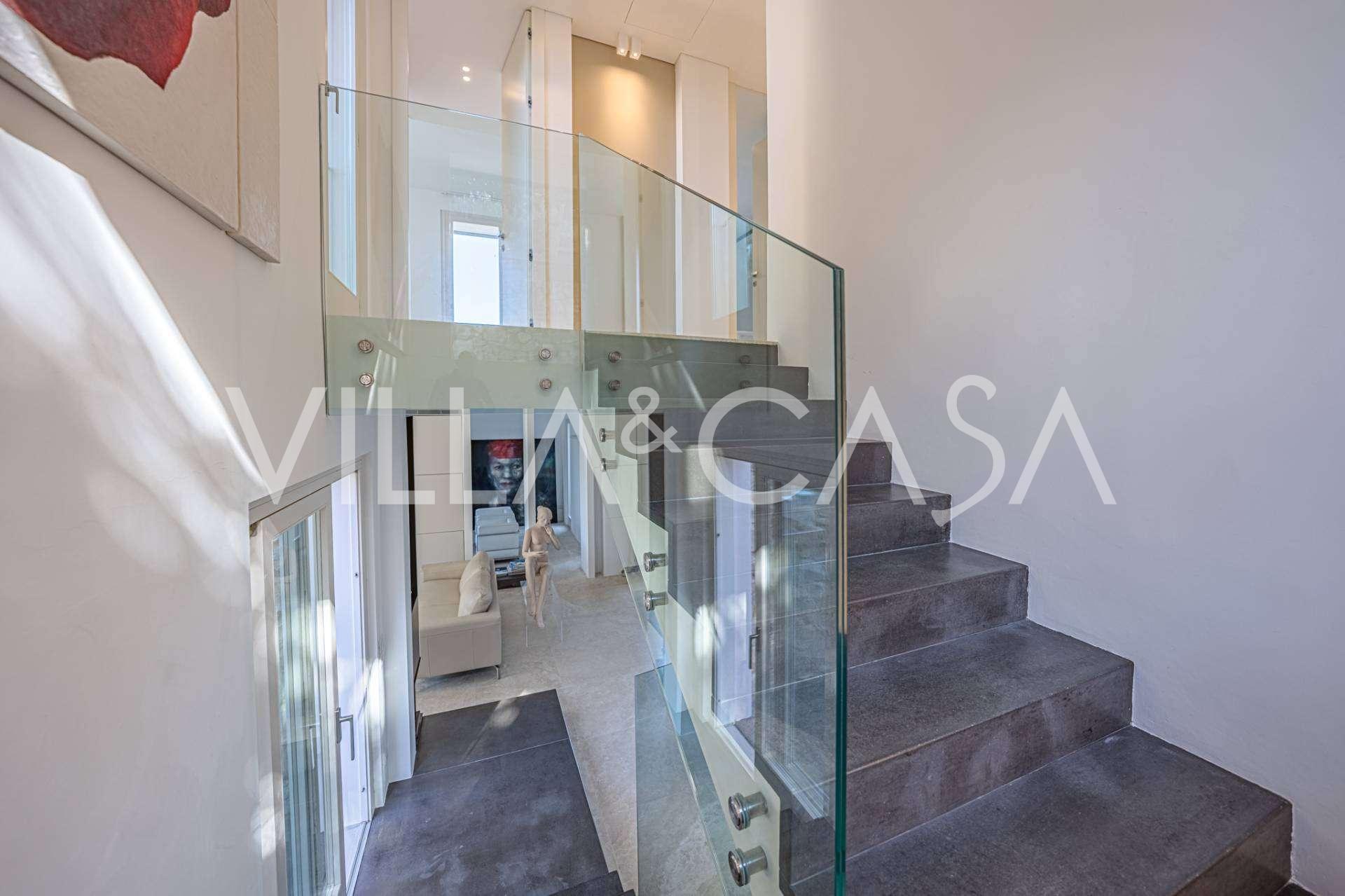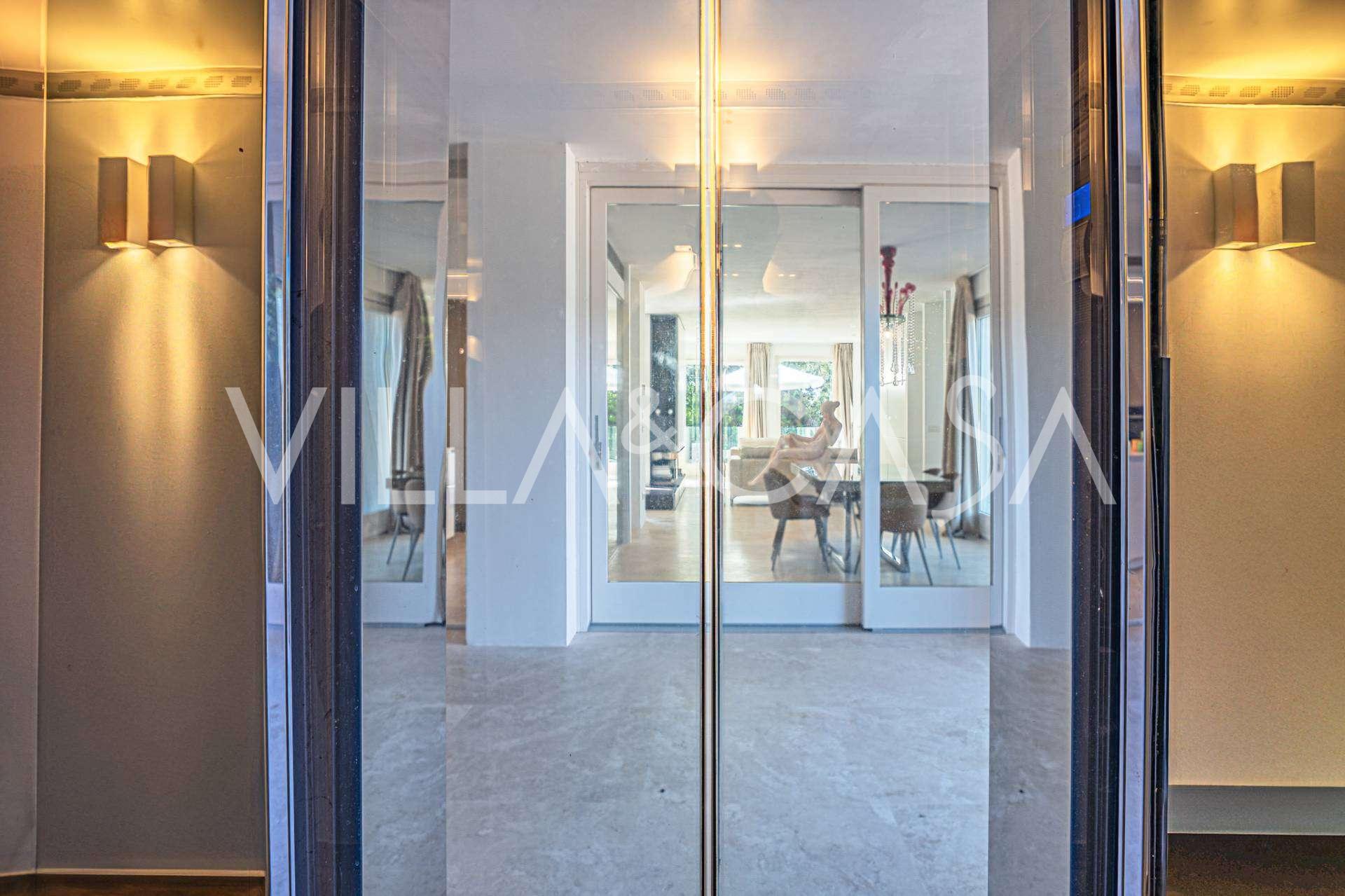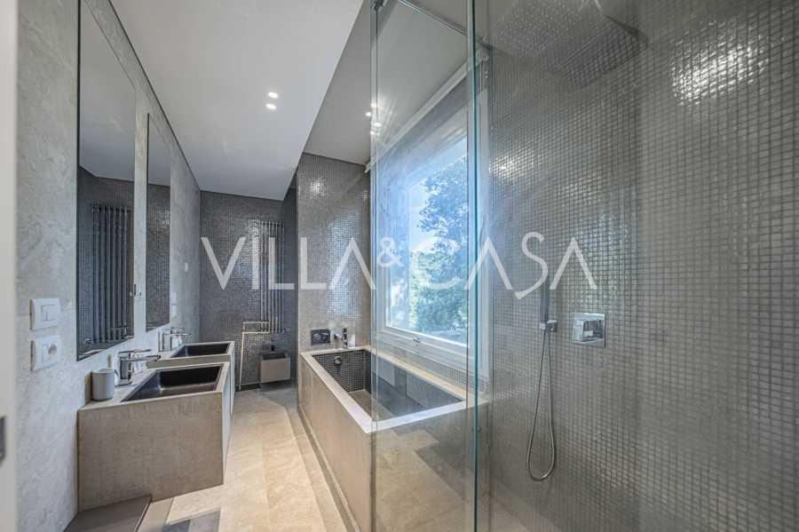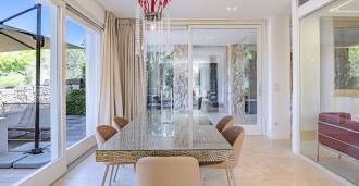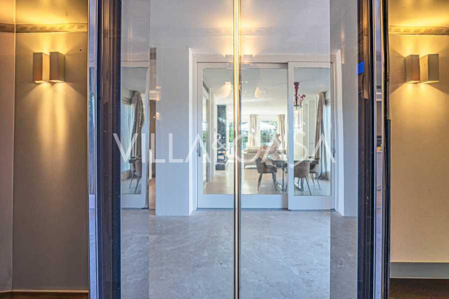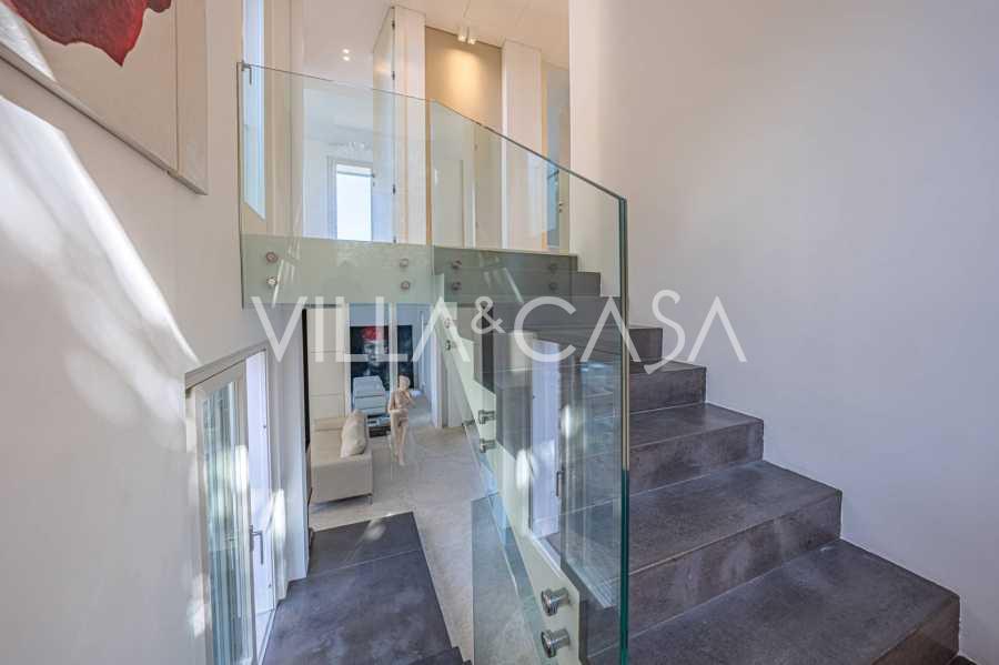 For nylig fuldstændig renoveret og fordelt på fire niveauer, forbundet med en intern elevator, udviser residensen en sjælden elegance og raffineret funktionalitet. Arkitekturen med sine fejlfri linjer og glasfacader skaber harmoni mellem de indre rum og de charmerende terrasser. Villaen er omgivet af en velplejet terrassehave på 500 m², der tilbyder ejere privatliv og ro, hvor der også er gemt et udsøgt afslapningsområde med swimmingpool.
