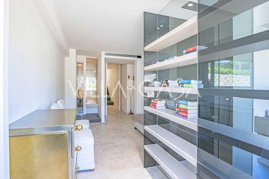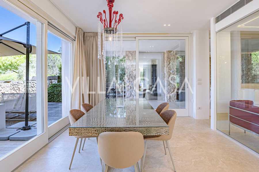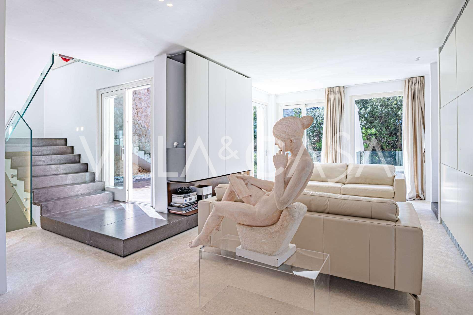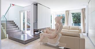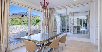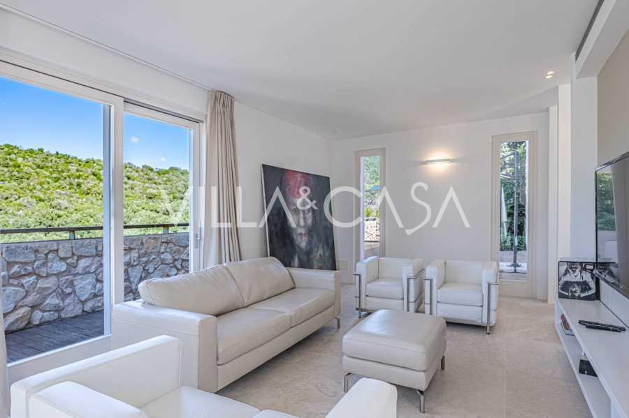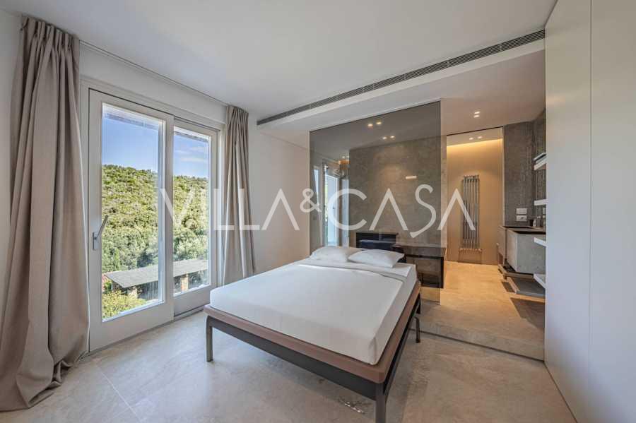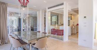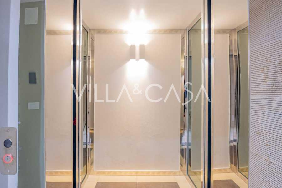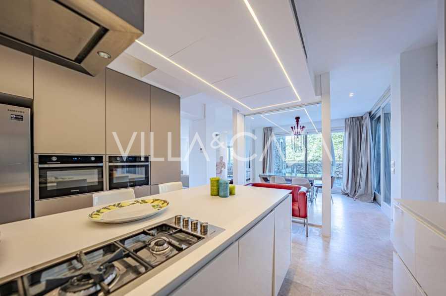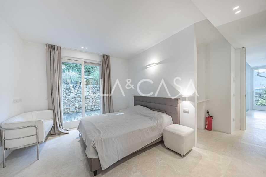 For nylig fuldstændig renoveret og fordelt på fire niveauer, forbundet med en intern elevator, udviser residensen en sjælden elegance og raffineret funktionalitet. Arkitekturen med sine fejlfri linjer og glasfacader skaber harmoni mellem de indre rum og de charmerende terrasser. Villaen er omgivet af en velplejet terrassehave på 500 m², der tilbyder ejere privatliv og ro, hvor der også er gemt et udsøgt afslapningsområde med swimmingpool.