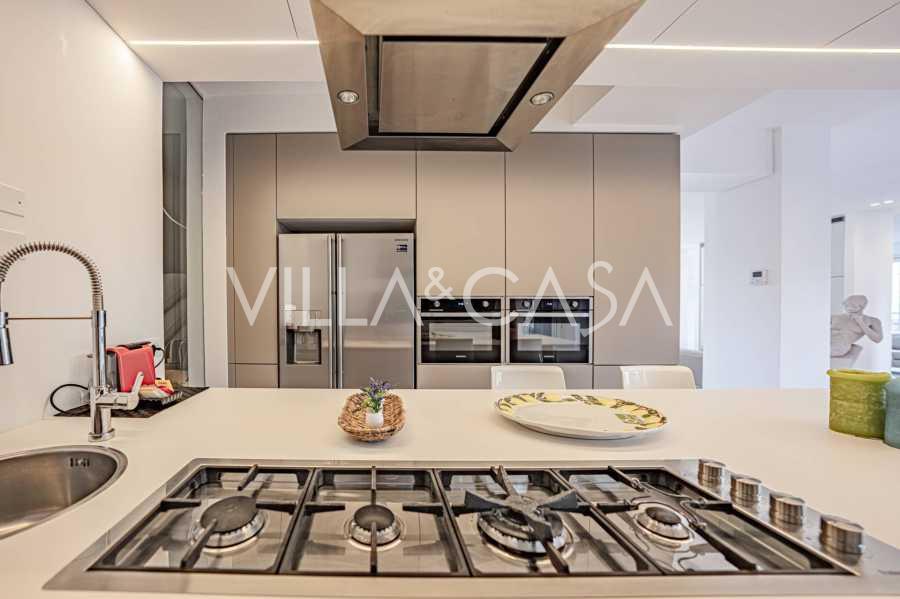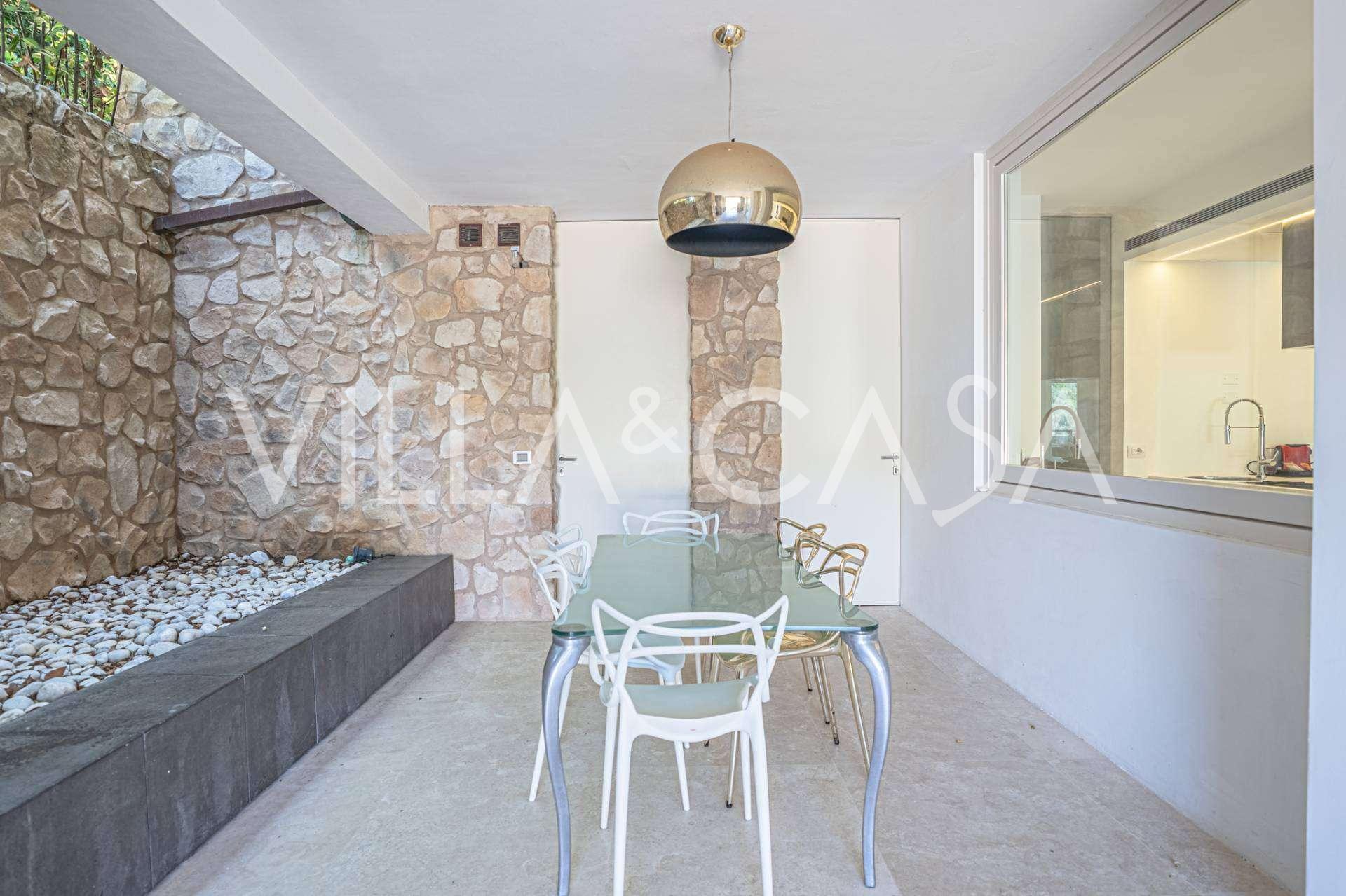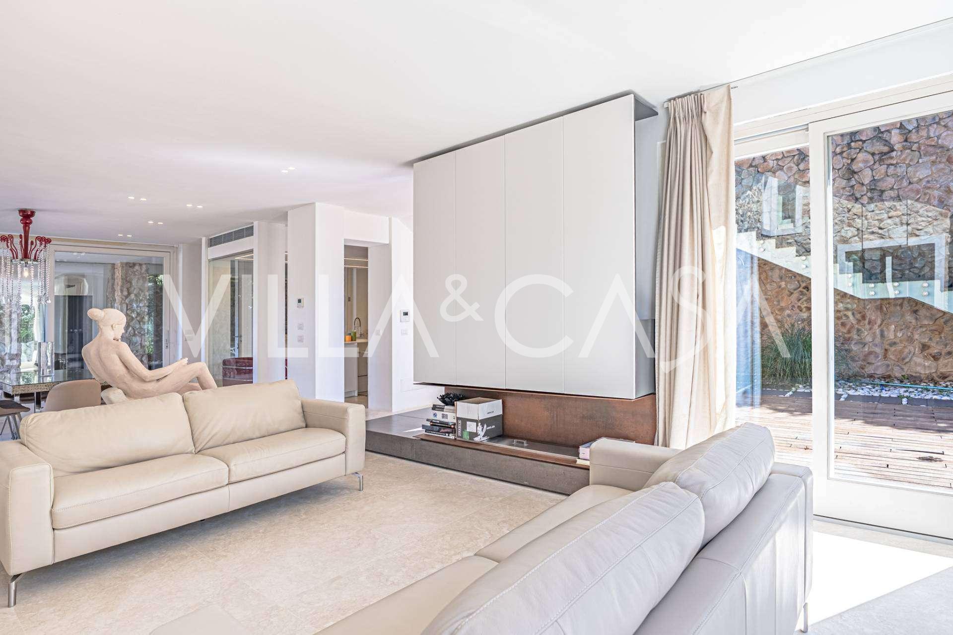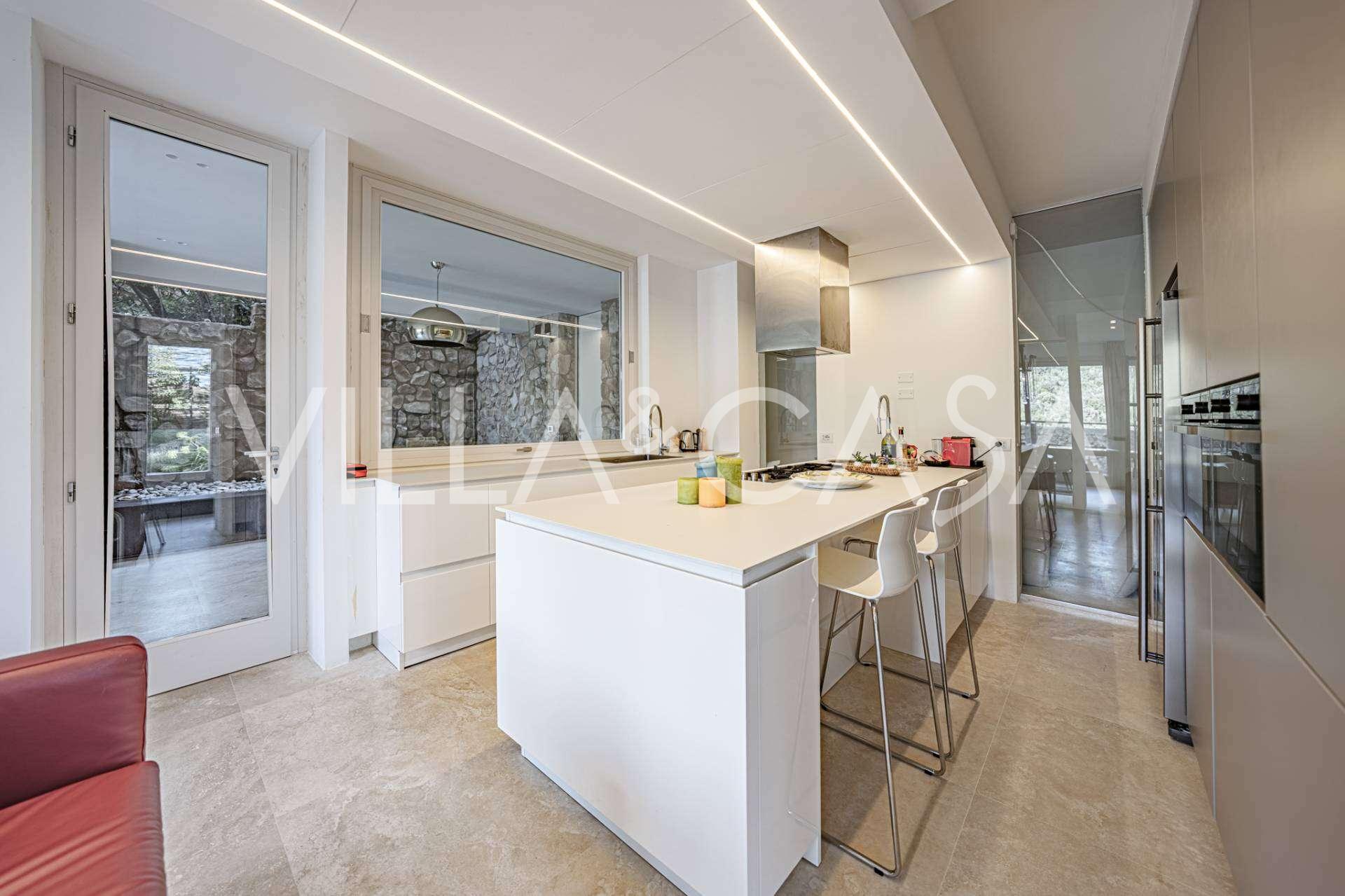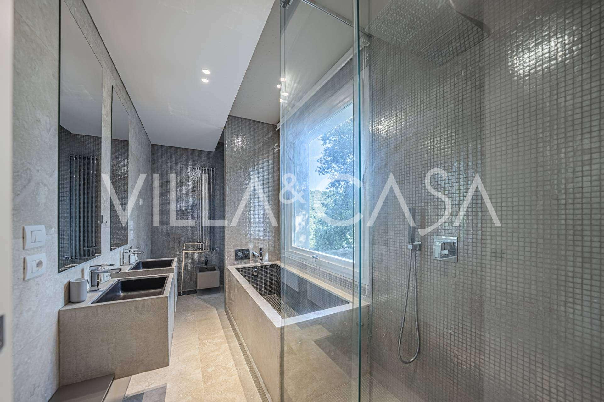 For nylig fuldstændig renoveret og fordelt på fire niveauer, forbundet med en intern elevator, udviser residensen en sjælden elegance og raffineret funktionalitet. Arkitekturen med sine fejlfri linjer og glasfacader skaber harmoni mellem de indre rum og de charmerende terrasser. Villaen er omgivet af en velplejet terrassehave på 500 m², der tilbyder ejere privatliv og ro, hvor der også er gemt et udsøgt afslapningsområde med swimmingpool.