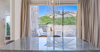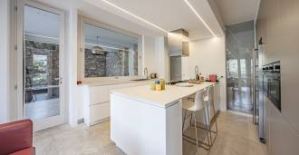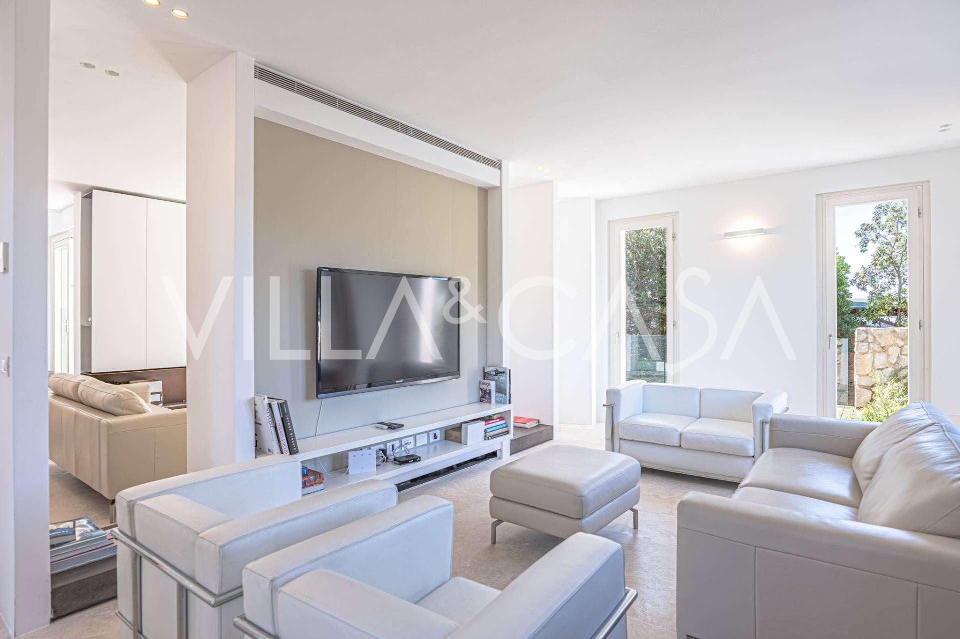 Det samlede areal af de indre rum udgør 380 m². På stueetagen findes et storslået receptionsområde med en rummelig stue, der fører ud til en stor spiseterrasse med havudsigt, en udsøgt opholdsstue og en elegant spisestue, der er forbundet med et fuldt udstyret køkken af høj klasse.